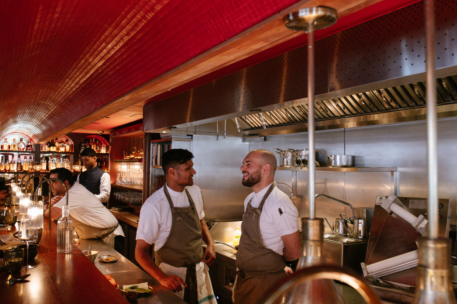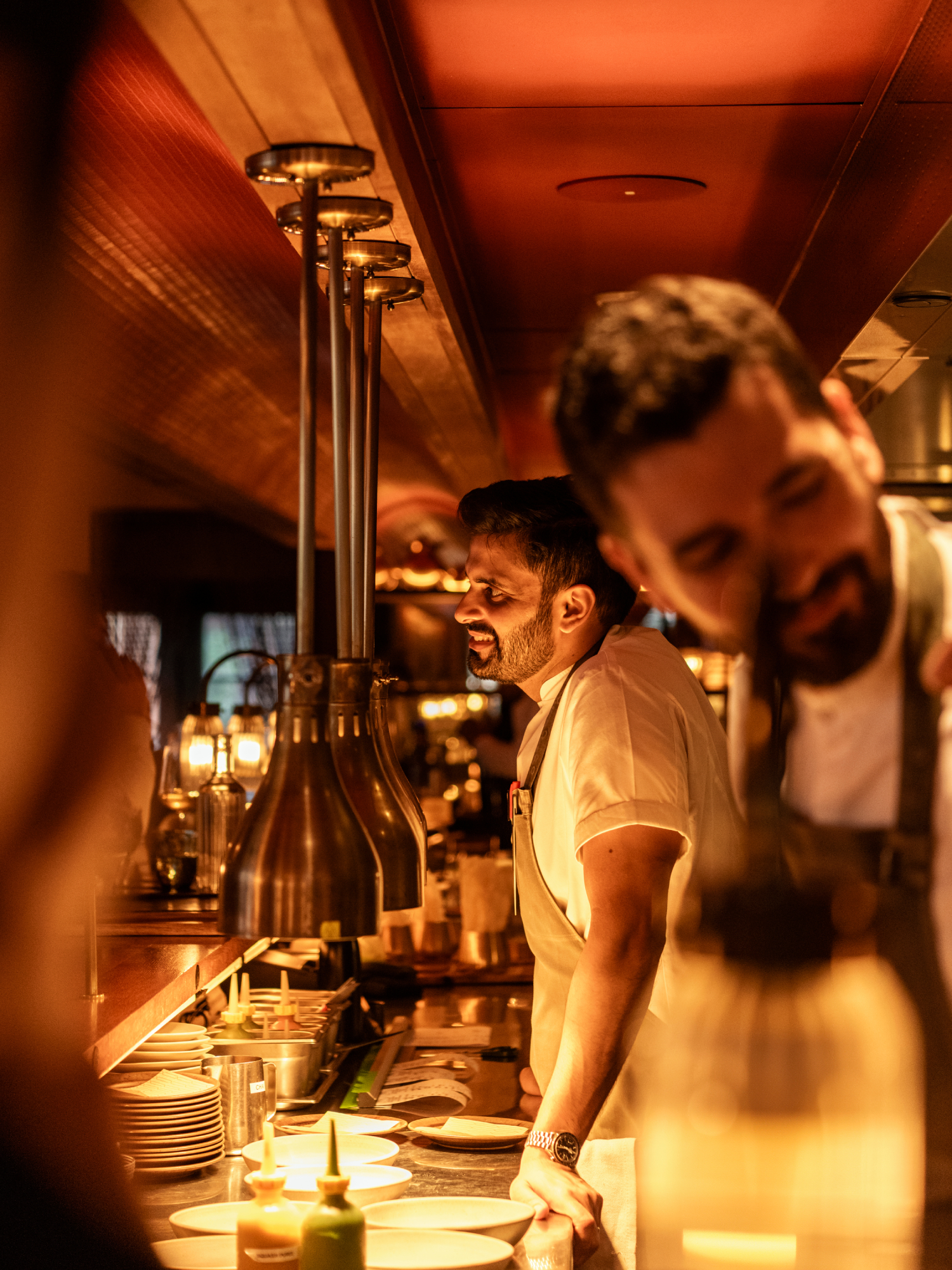 乘著涼爽帶風的光,一走進去 Bibi,首先撲鼻而來的是香氣,那是種能將氣味蒐集起來裝瓶販售的高級風情,瀰漫整個空間的辛香,柔和又誘人,不同於以往印度餐廳常見的芥末油、炸洋蔥和辣椒所帶來猛烈直搗喉頭的衝擊,從開放式廚房飄出的香味細緻且平衡,同時完全佔據感官。幾個大男孩風格的廚人在吧台後方炭烤、煎煮、備餐,Chet Sharma 與同事們之間營造出輕鬆自在的氛圍,但又能看出他們對於餐點的嚴謹及重視。