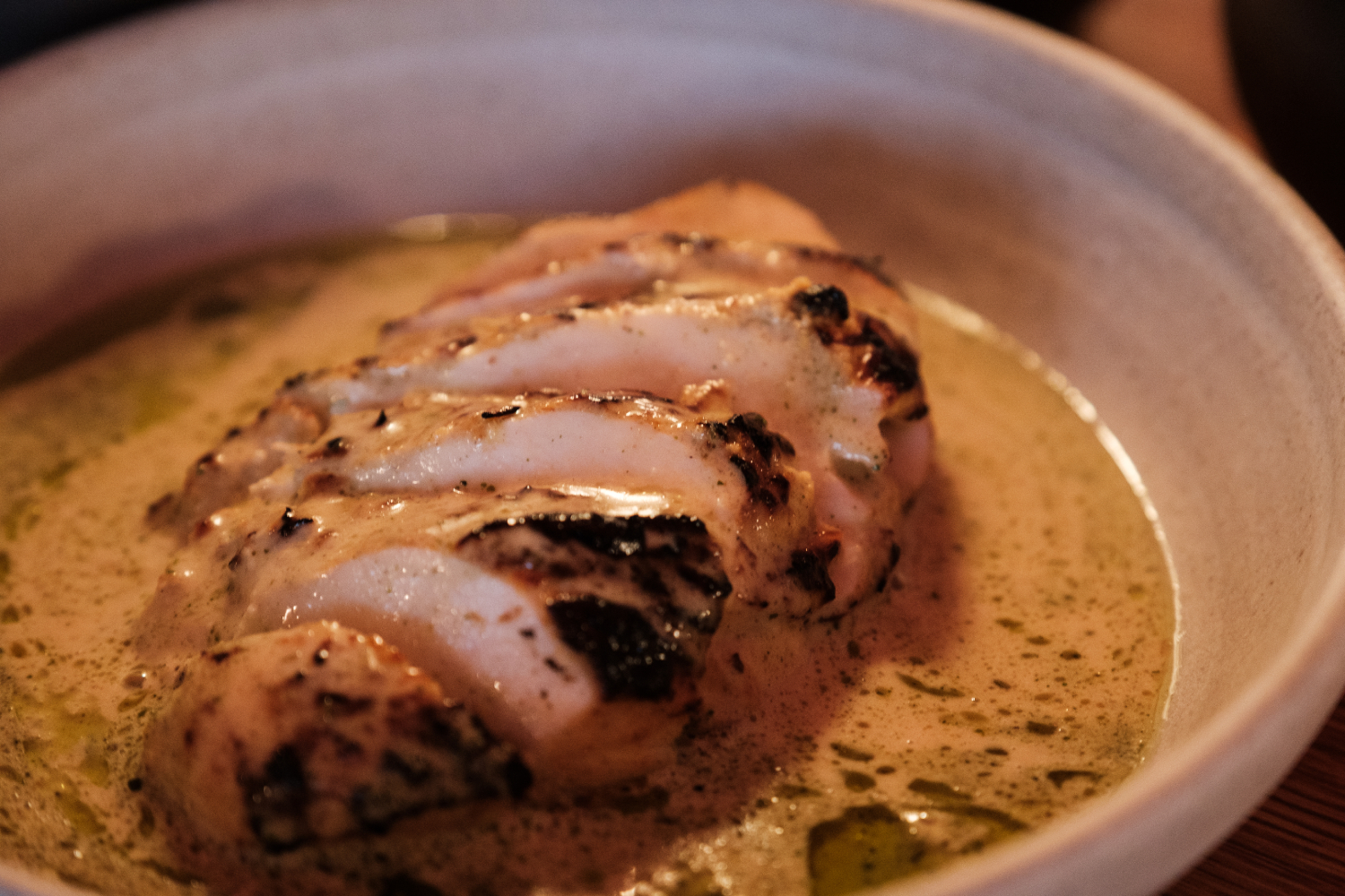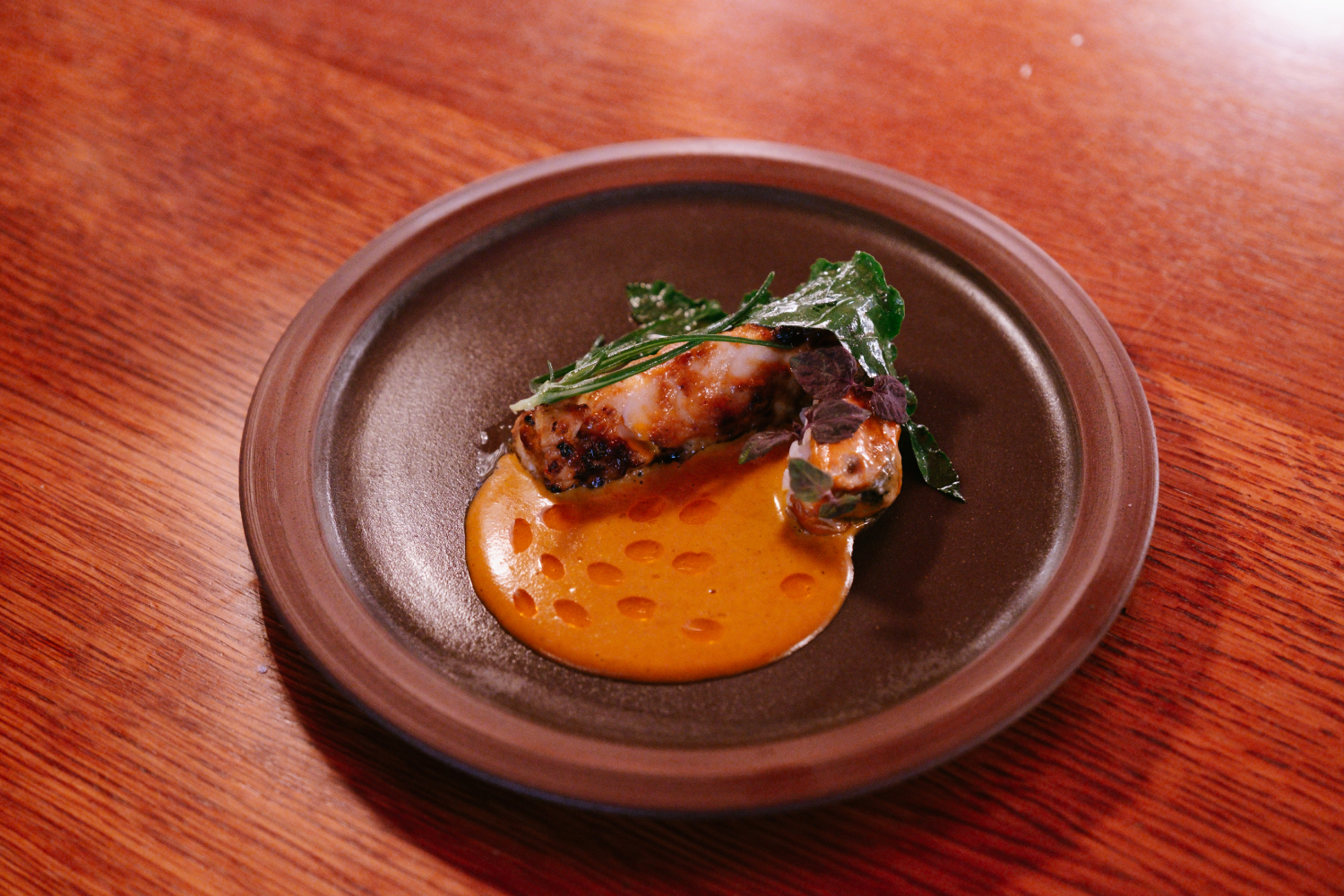 來自英國西岸康沃的鮟鱇魚,碳烤至焦香卻保留腴美魚脂,搭配花生和芝麻為主調的 Salan 醬汁,另佐滑嫩淡菜更讓海味昇華。這道料理的 Salan 醬汁,源於 Chet Sharma 遊歷印度時在海德拉巴的飲食經驗。