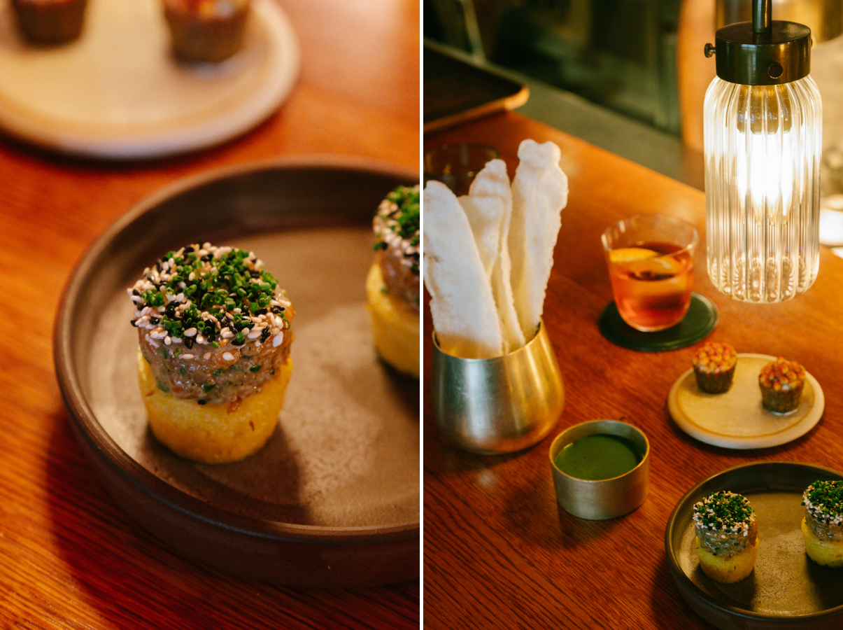 午間菜單由兩款精緻前菜小點展開,黑鷹嘴豆脆皮酥盒(Croustade)佐薑與覆盆子優格,另一個鱒魚塔塔搭配蘿蔔與芝麻,底下則是如海綿蛋糕體般的鹹糕 Dhokla。