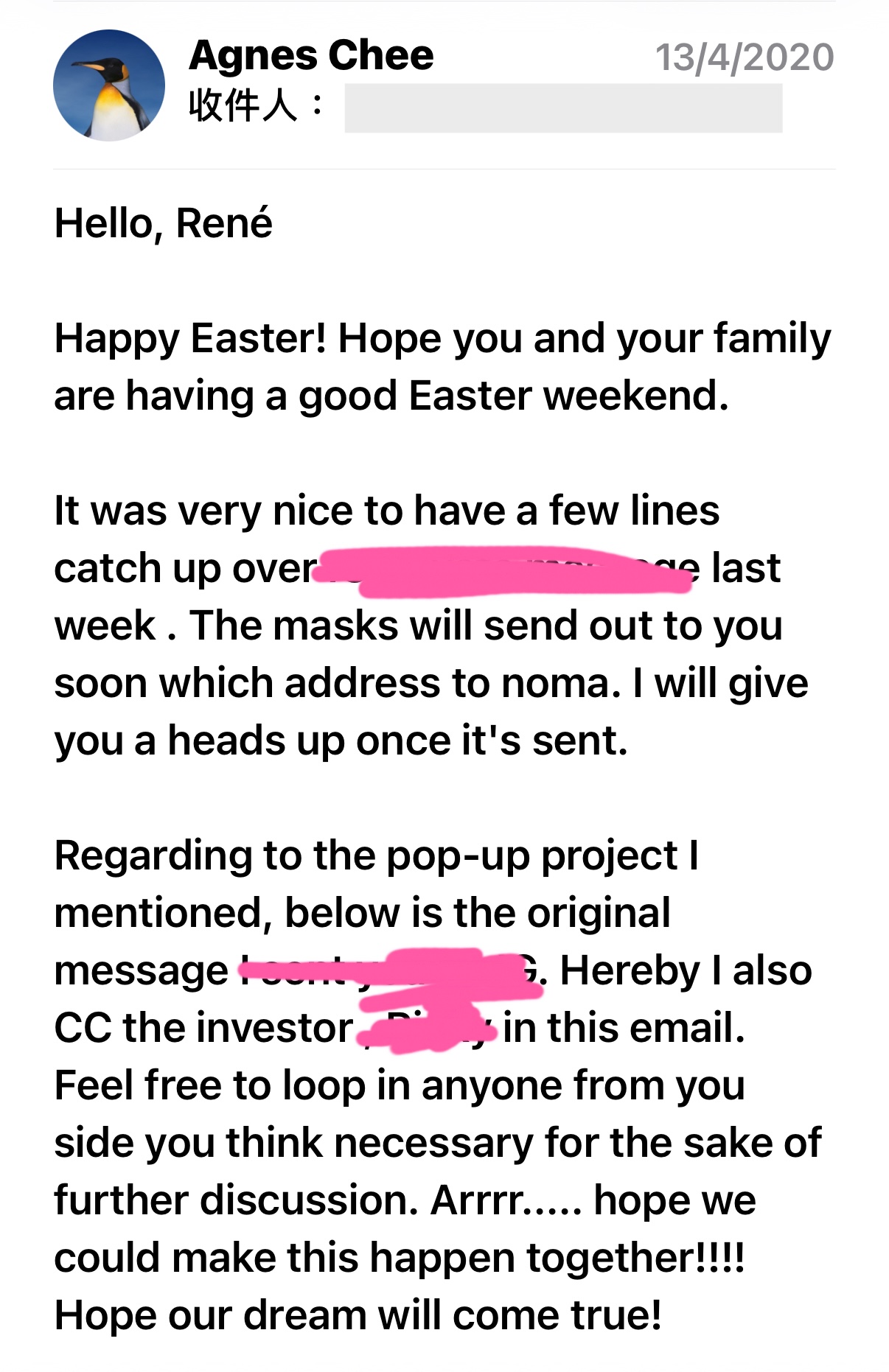 跟 Noma 談生意,始於這封電郵。當時正值疫情期間,還給 Noma 寄去了幾百個口罩以當慰問。這裡打開了一扇窗,讓我看到一個成功品牌的商業化運作。