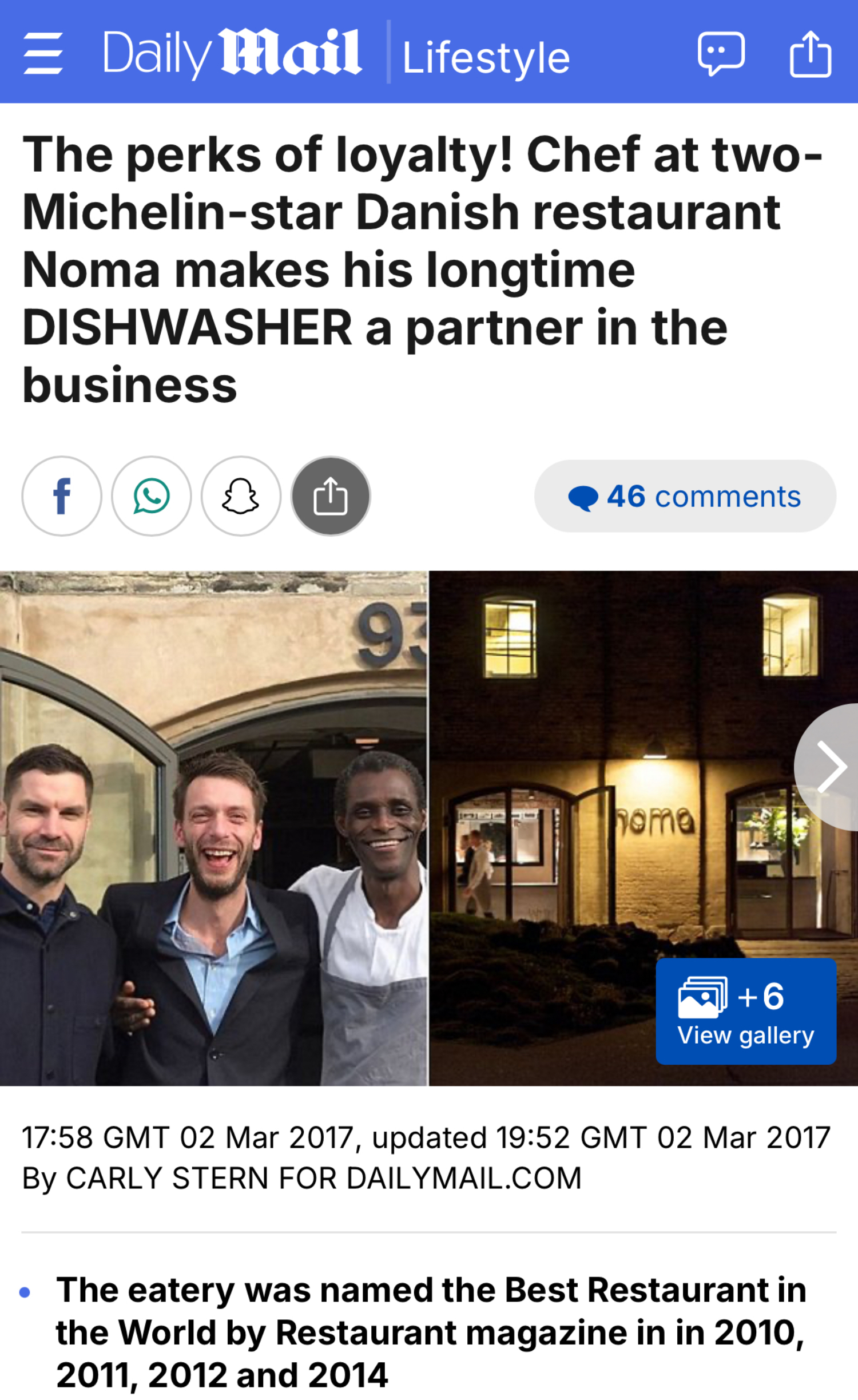 我得到的啟發,可以用這個例子來解釋一二:大家最為津津樂道,莫過於在 2017 年,Noma 把洗碗員工 Ali Sonko 擢升爲合夥人,這創舉將 Noma 推上了全球的新聞熱點,輿論譁然、博盡眼球,同時令人產生「這是最好的雇主」、「世界上最幸福工作地點」、「這公司重視尊重與平等」的印象。其實在更早之前:2010 年 Noma 首度獲頒「世界 50 最佳餐廳」第一名之際,當時 Ali 因為簽證問題無法跟團隊一起到倫敦領獎,René 便領著團隊,穿上印有他肖像的 T-shirt 一起上台。確實很有創意,也令人感動。我個人以為,在 2010 年,這舉動是真心真意。