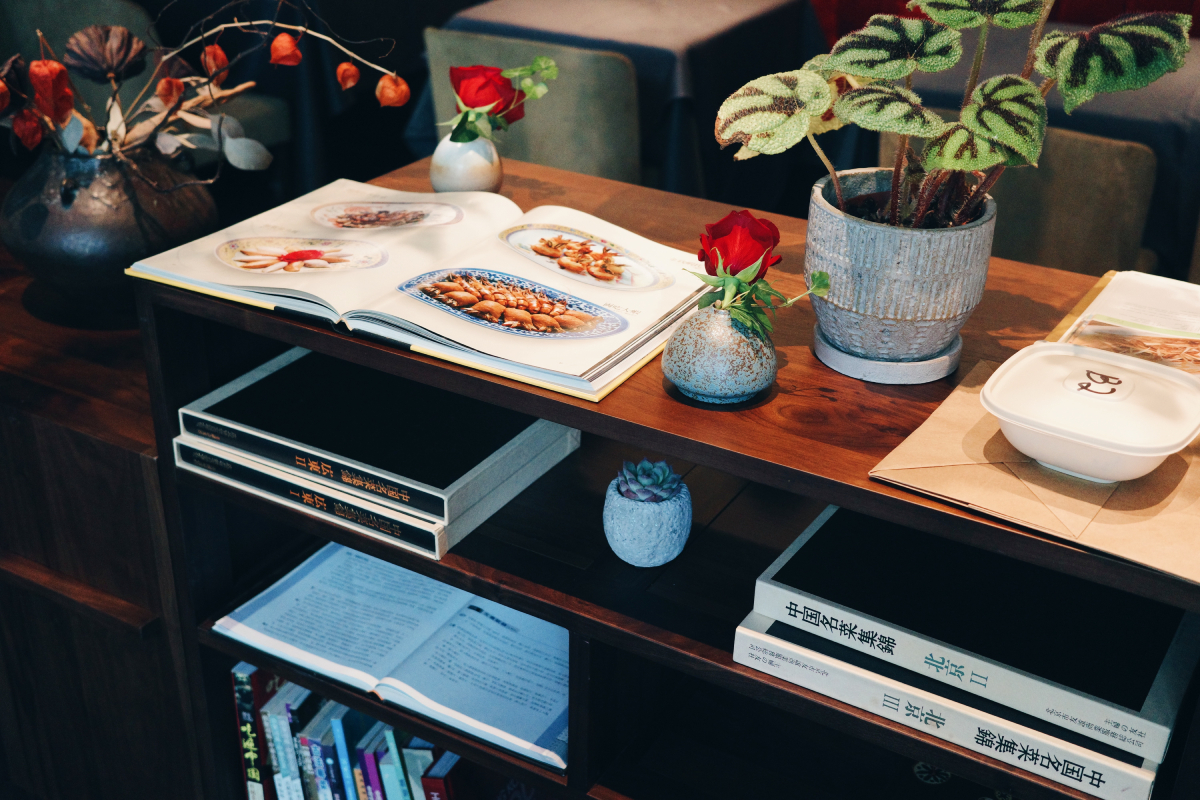 走晃一圈,以矮身木櫃上展示的飲食經典《中國名菜集錦》最為顯眼,蹲低一看也有驚奇,竟擺列漫畫家寺澤大介的《妙手小廚師》、安倍夜郎的《深夜食堂》全系列漫畫,為餐廳增添一絲家宅的親切。
