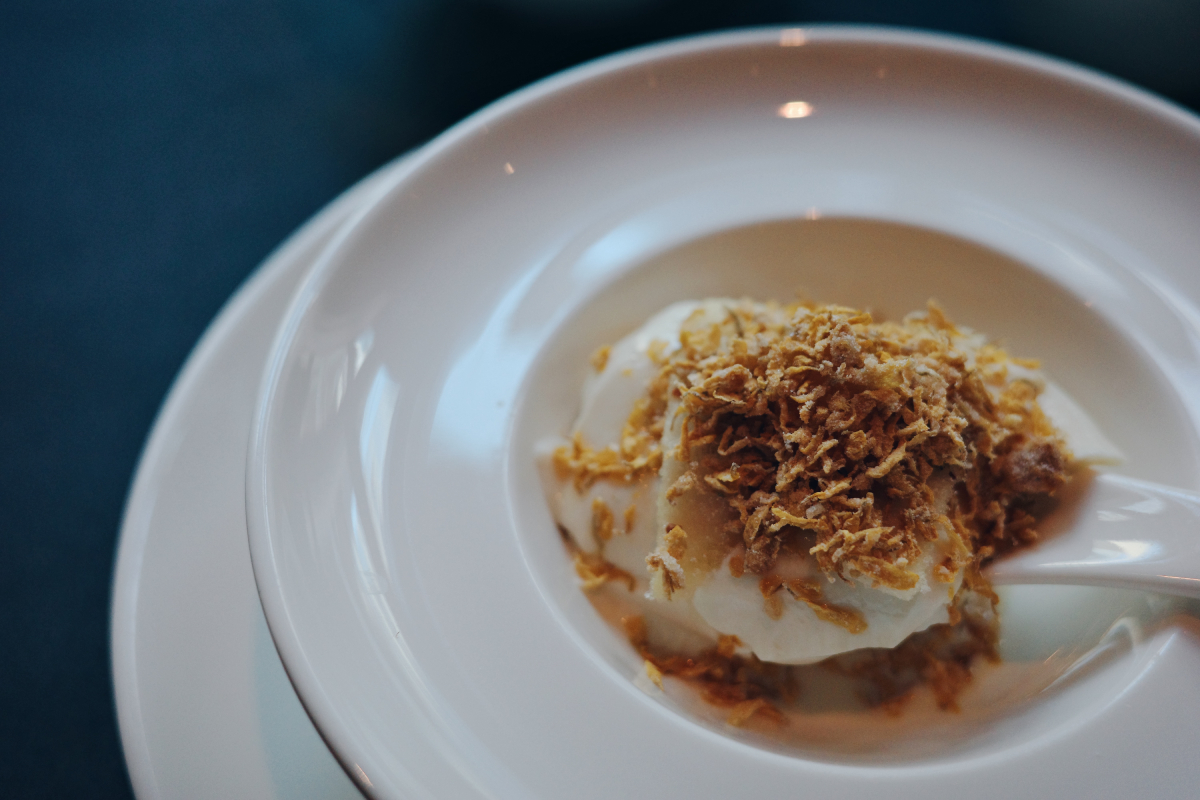 出乎意料的插曲是,友人在享用魚湯白木耳浸瓜絲時,竟誤食異物,從口中吐出一小塊陶瓷碎片,差點就吞下肚。反映之後,侍者向廚房詢問,確認應為瓷盤碰撞的邊緣殘角,雖說是 Fine dining 餐廳不該發生的失誤,但至少誠實以報而非粉飾太平。