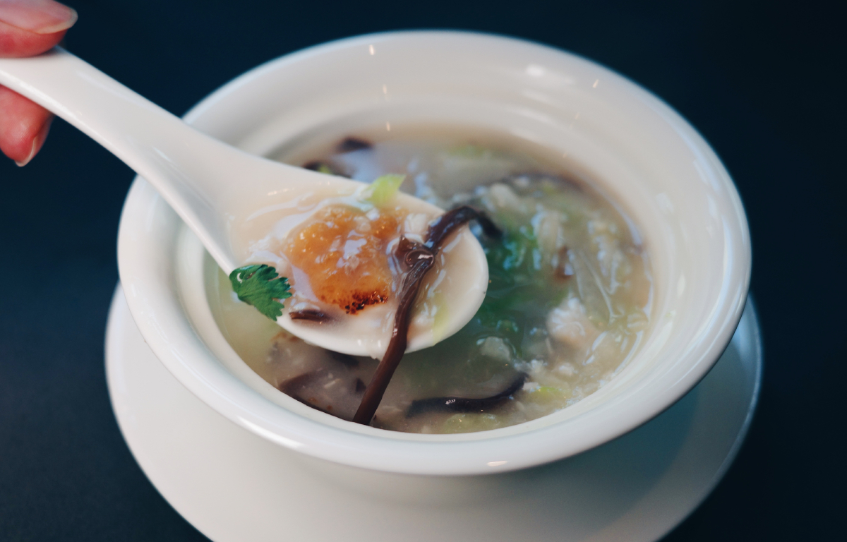 另一道「魚湯白木耳浸瓜絲」為蔬菜與湯品的結合,湯底竟是以魚眼珠、魚雲(指魚鰓兩側、僅有兩小塊呈半透明膠狀的魚肉)與白木耳燉熬而成,兩類食材的膠質為鮮美魚湯賦予濃稠基調,對比瓜絲、黑木耳的爽脆,輕盈舒心。