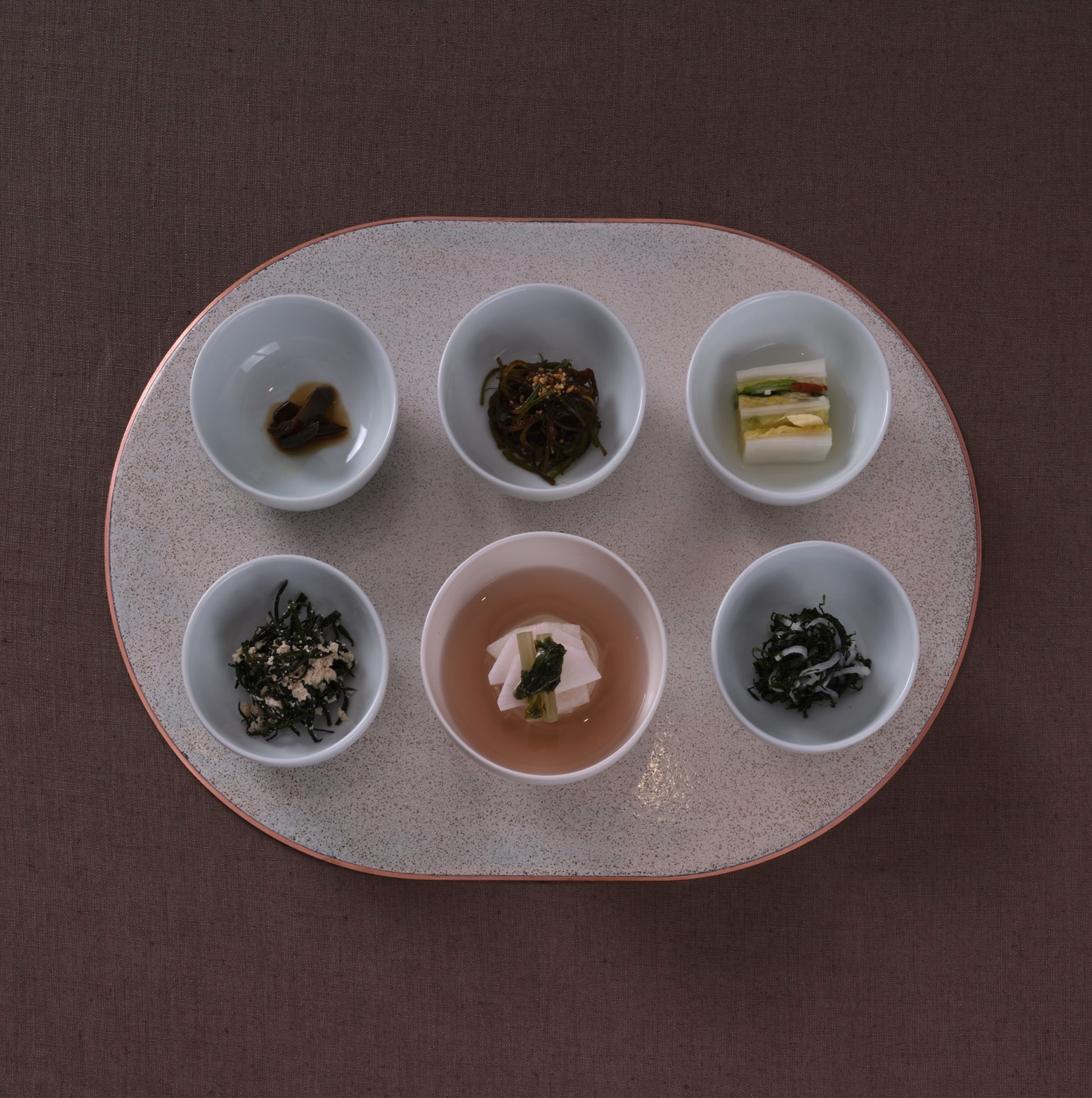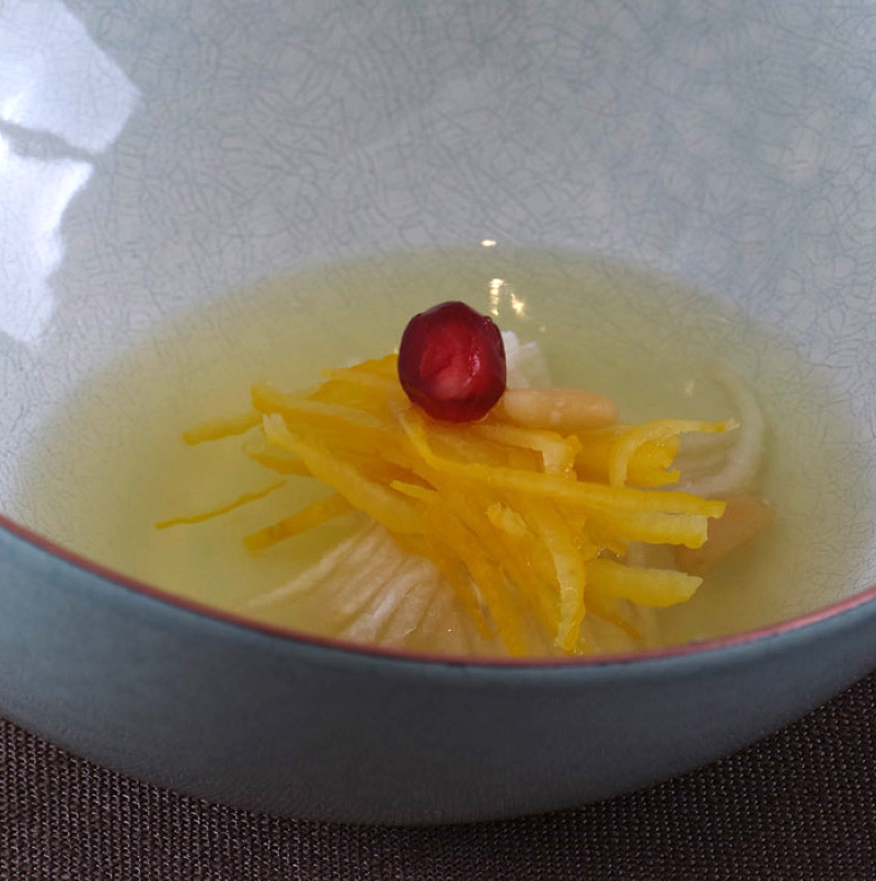 김대천 셰프가 떠올린 질문은 하나다. “1000년 전 한국 사람들은 어떤 음식을 먹었을까?” 마늘이나 기름, 고기 등이 일상화되지 않았던 시대. 그 시대의 상상 속 음식은 오히려 지금보다 더 절제된 모습일 것이다. 지금 한식에서 과도하게 활용되는 마늘 등의 향신 채소와 강한 맛은 근대화 이후의 산물이다. 가난했던 농경 사회의 한국에서, 향신료를 많이 쓸 수 없었을 것이라는 결론에 이르렀다. 소금도 귀했을 것이다. 그러다 보니 화려하기보다는 자연스럽게 소박한 요리들이 많이 떠올랐고, 이런 요리를 만들다 보니 오히려 더욱 원재료의 맛과 향에 집중하게 되는 결론에 이르렀다. 절제하는 것, 1000년 전 내가 생각하는 한국의 음식, 그리고 오신채를 쓰지 않고 음식 또한 수행의 일부라고 생각하는 사찰 음식의 정신이 어우러졌다. 이런 사유가 오신채를 배제하고, 재료 본연의 맛에 집중하게 만든 배경이다.