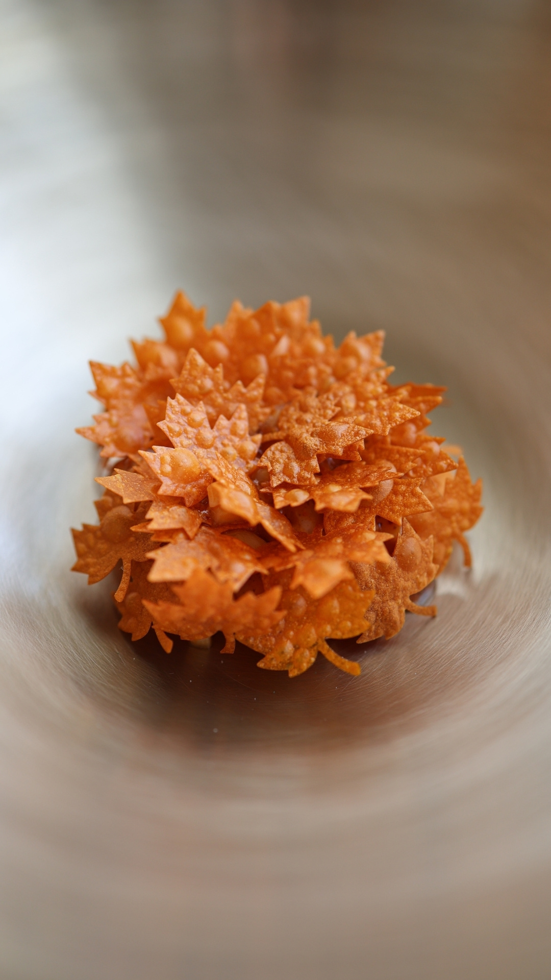 꽃잎처럼 정교하게 칼집을 낸 새하얀 백김치 위로 허브와 식용 꽃, 엘더플라워 오일을 더해 장식했고, 이 디시에 가장 잘 어울릴 그릇은 한국의 한 갤러리에서 찾았다.