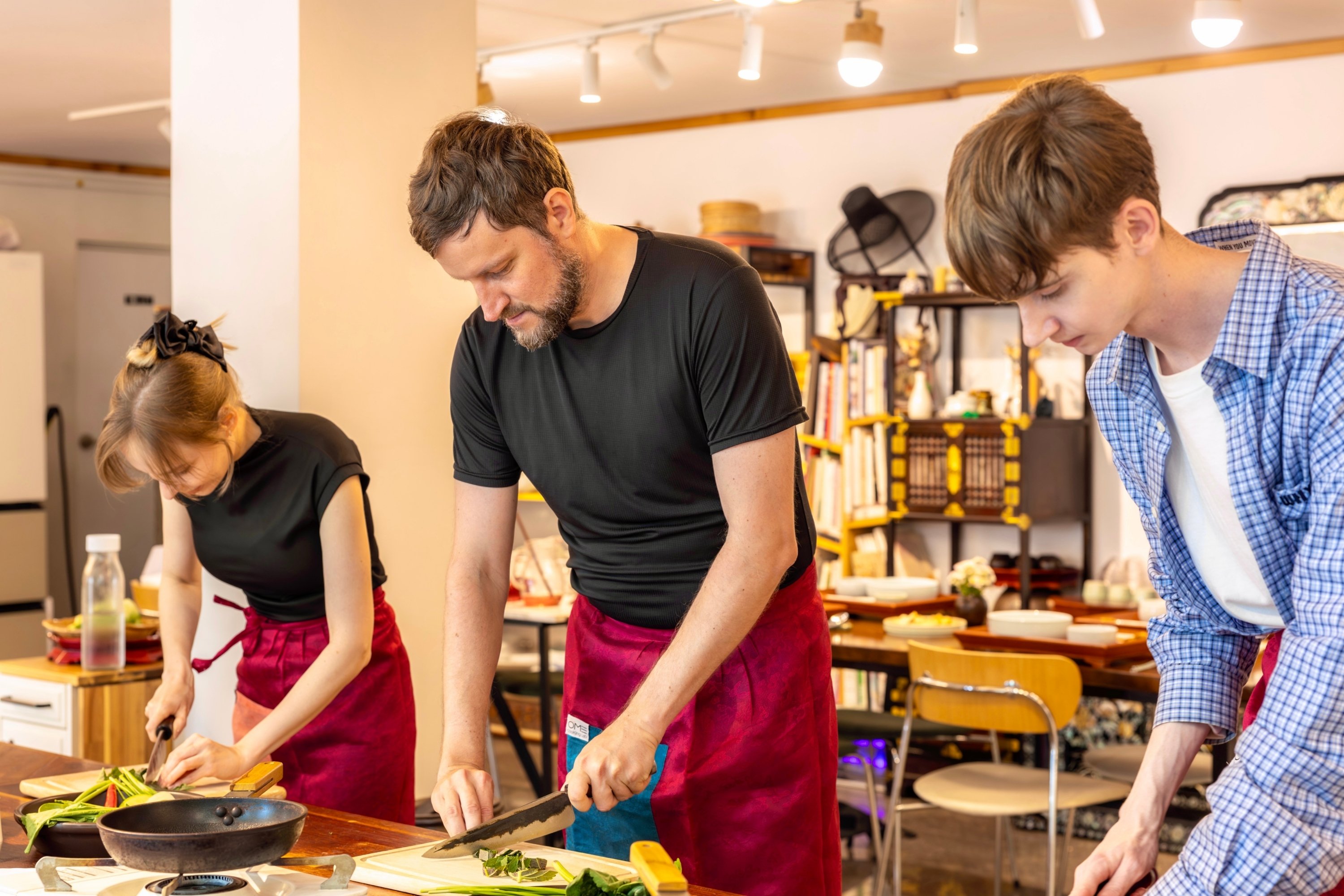 외국인 대상 한식 쿠킹 클래스에 참여해 요리에 열중하고 있는 한 가족
