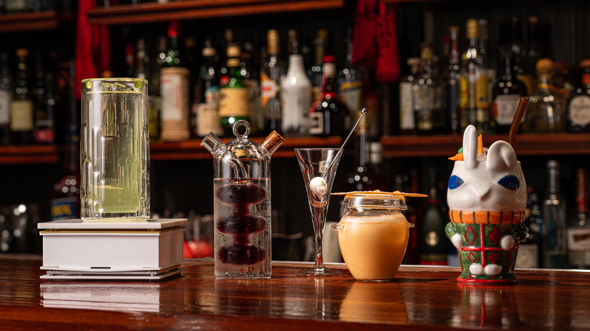 앨리스 청담은 이야기로 설계돼 있다. 좁은 계단은 토끼굴을 상징하고, 미세하게 기울어진 조명과 향의 농도, 손끝으로 느껴지는 벽의 질감까지 모두 철저하게 기획된 것이다. 이곳의 무드와 하나가 되면, 어느새 외부의 소음은 사라지고 동화 속으로 걸어 들어온 듯한 기분이 든다. 실제로 바 곳곳엔 토끼와 고양이처럼 이야기 속 인물을 상징하는 오브제가 놓여 있는데, 정작 주인공인 ‘앨리스’는 존재하지 않는다.