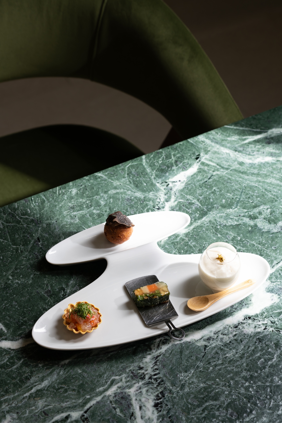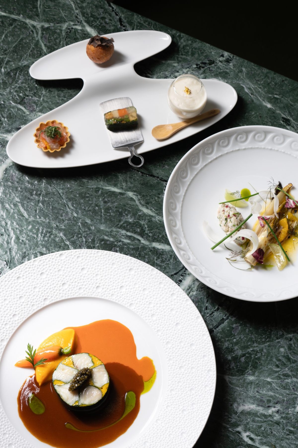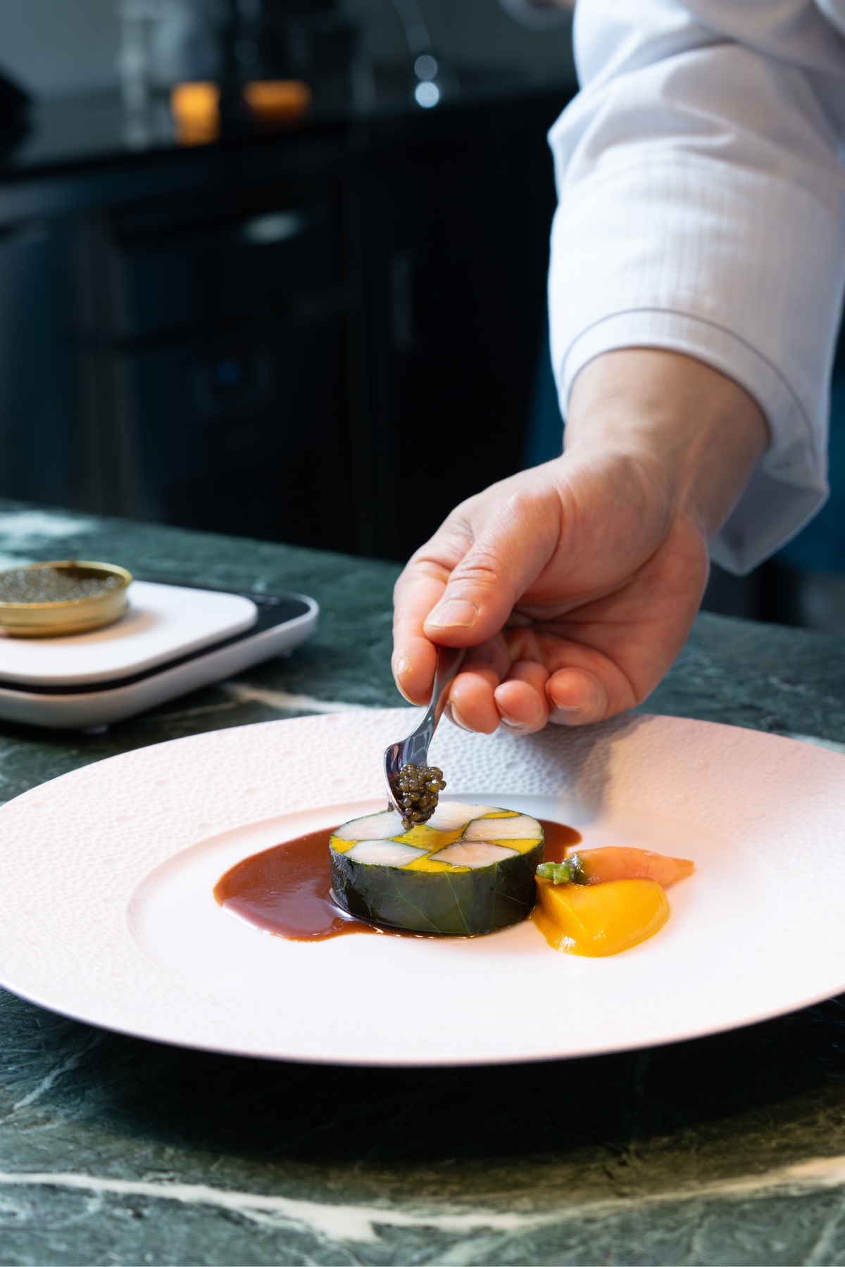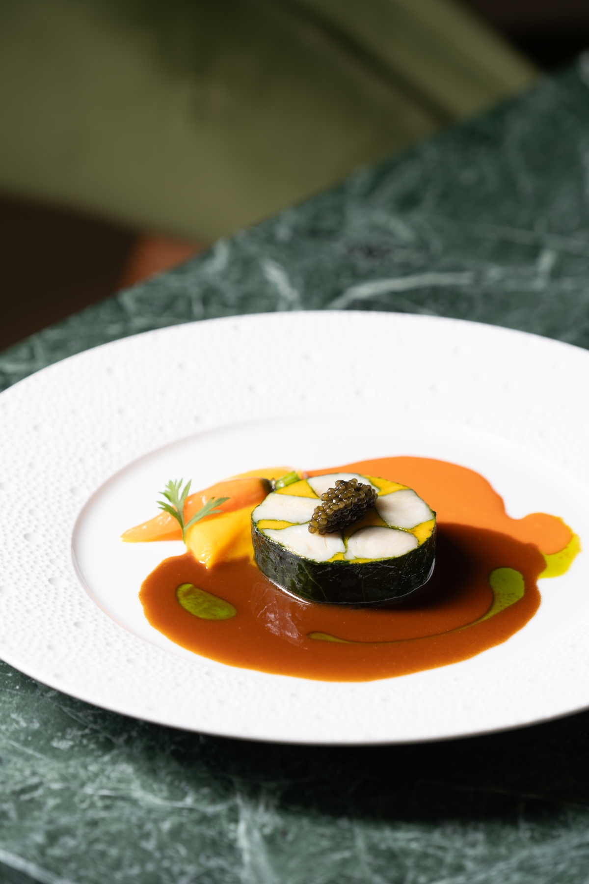 ‘부시리와 당근 무슬린을 말아낸 룰라드, 카비아리의 캐비아(Roulade de Boushiri, Moussline de Carotte, Kaviari Caviar)’를 함께 즐길 수 있는 이 메인 디시는 색감부터 맛까지 우아한 감각의 파노라마가 펼쳐진다.