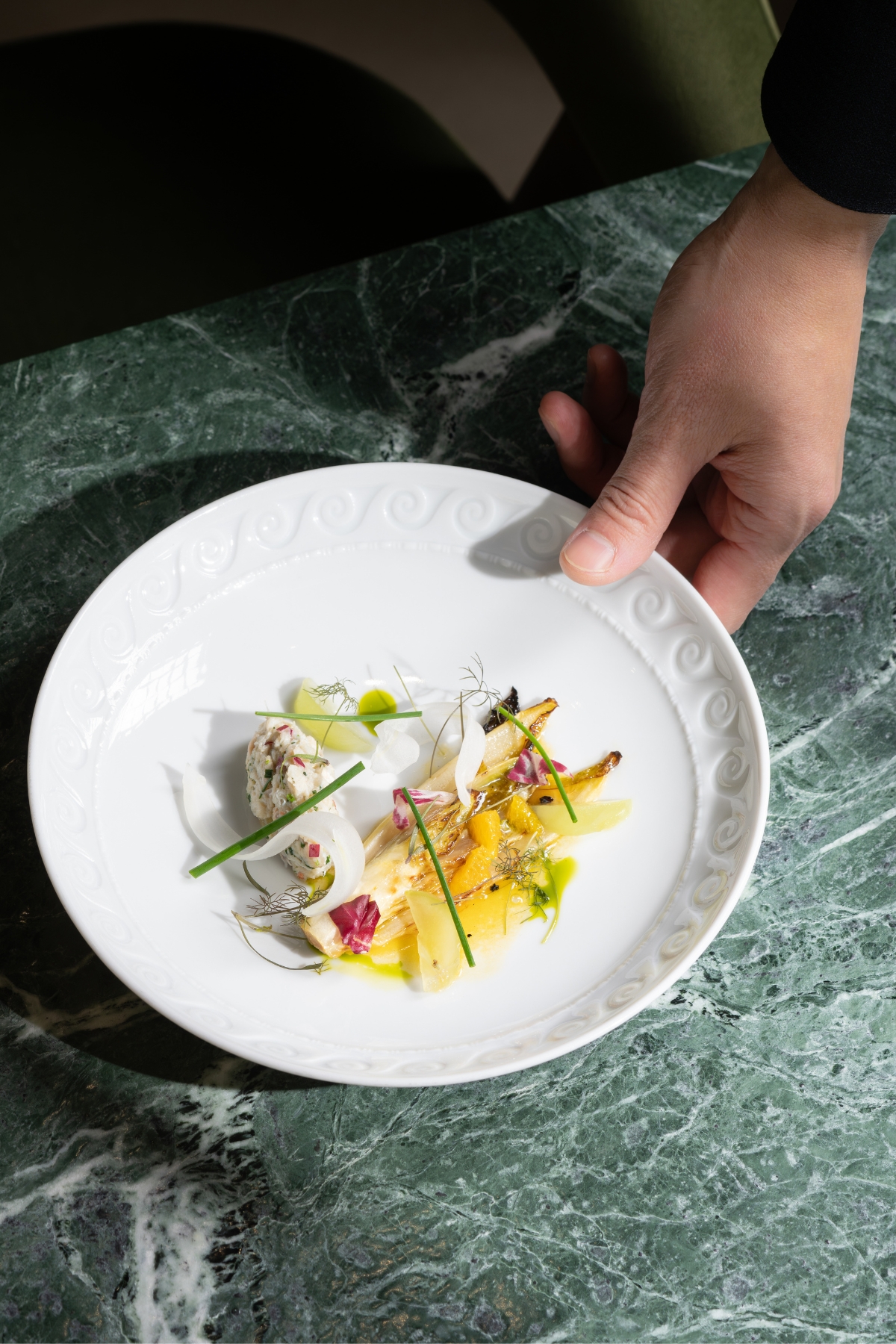 ‘오렌지 글레이즈가 더해진 엔다이브와 꽃게 리물라드(Endive Tiède, Rémoulade de Crabe)’ 디시는 식사의 산뜻한 오프닝을 장식한다.