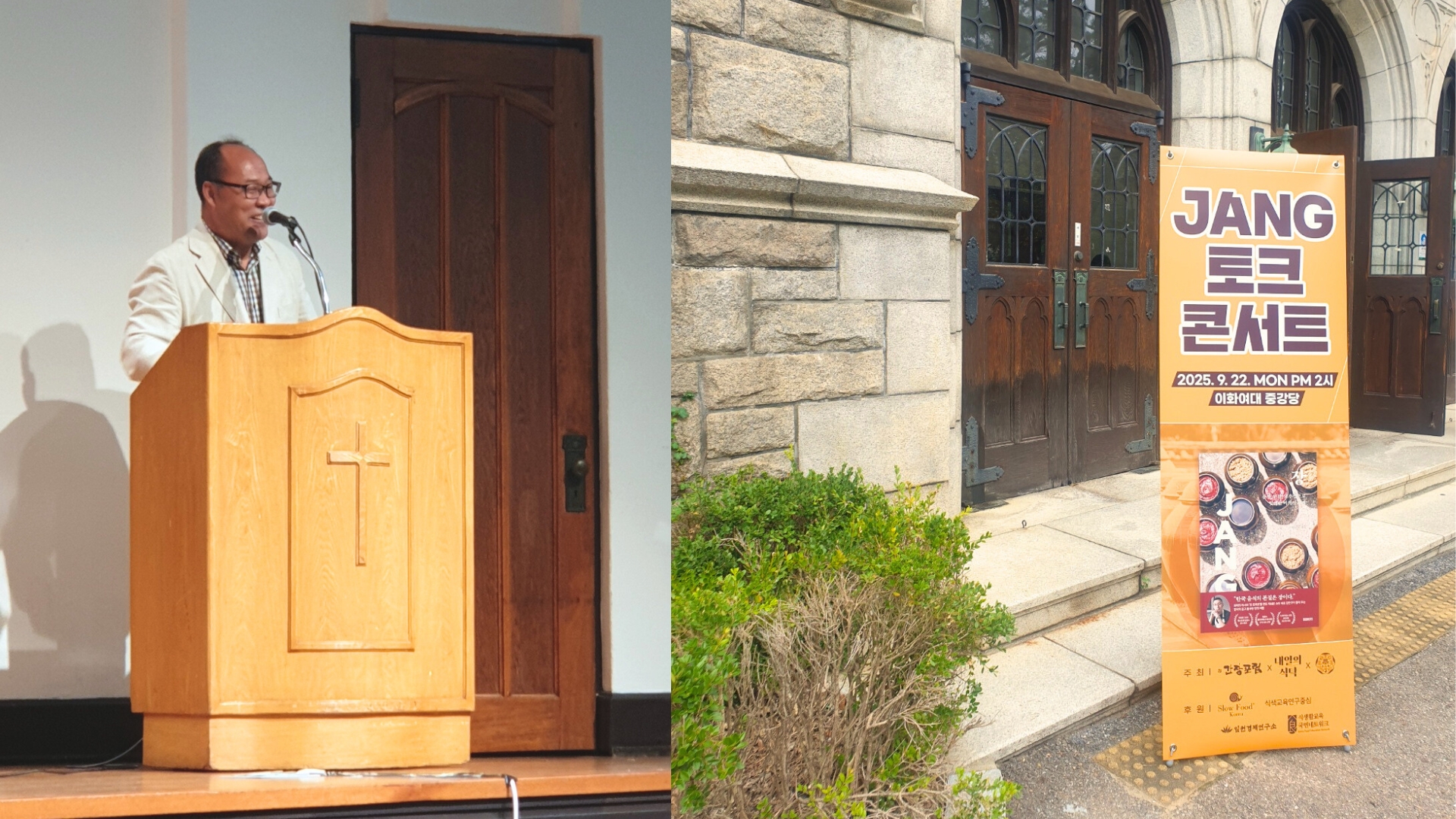 (좌) 이번 ‘북 토크 콘서트’를 기획하고 준비한 ‘간장 포럼’ 우태영 대표가 행사 취지를 설명하고 있다. (우) 이화여자대학교 중강당 입구에 놓인 ‘북 토크 콘서트’ 포스터