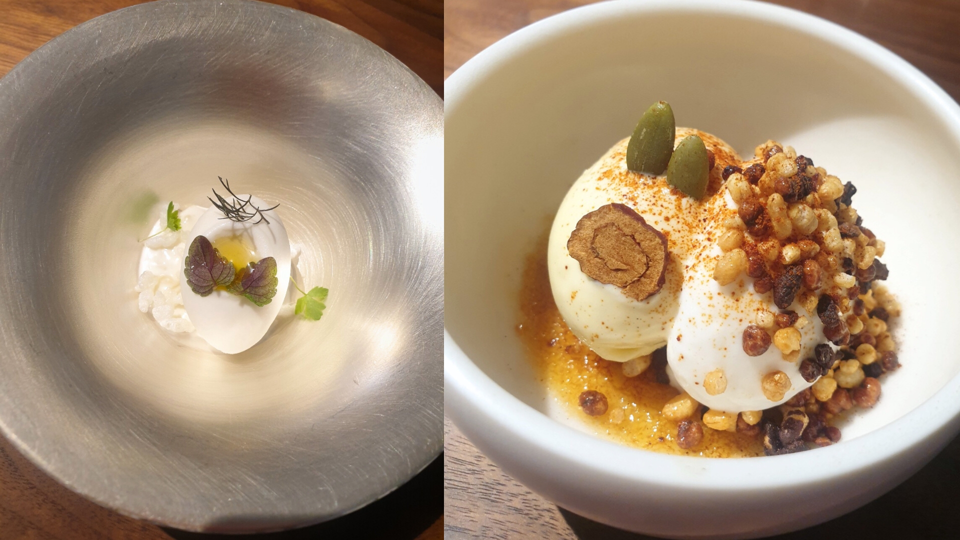 (좌) 찹쌀 푸딩과 찹쌀 아이스크림을 메인으로 한식 간장과 참기름의 풍미가 조화로운 ‘밍글스’ 디저트 ‘비빔밥’ (우) 된장 크렘블레, 간장 피칸, 고추장 튀밥에 바닐라와 위스키를 더한 ‘밍글스’의 시그니처 디저트, ‘장 트리오’