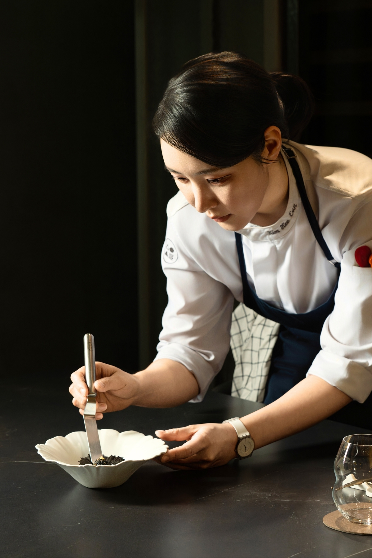 이러한 집요함은 시그니처 메뉴인 ‘미세스 김전복’에서 더 선명하게 드러난다. 김희은 셰프는 이 요리가 사랑 받는 이유를 ‘공감’이란 키워드로 설명했다. 한국인이 전복을 바라보는 기억과 감각을 그대로 접시에 옮기기 위해, 전복을 파도처럼 흐르는 곡선으로 플레이팅하고, 바다의 김을 자연스럽게 곁들였다. 기물 역시 ‘이야기를 담는 액자’라고 생각하며 직접 디테일한 형태를 설계했다.
