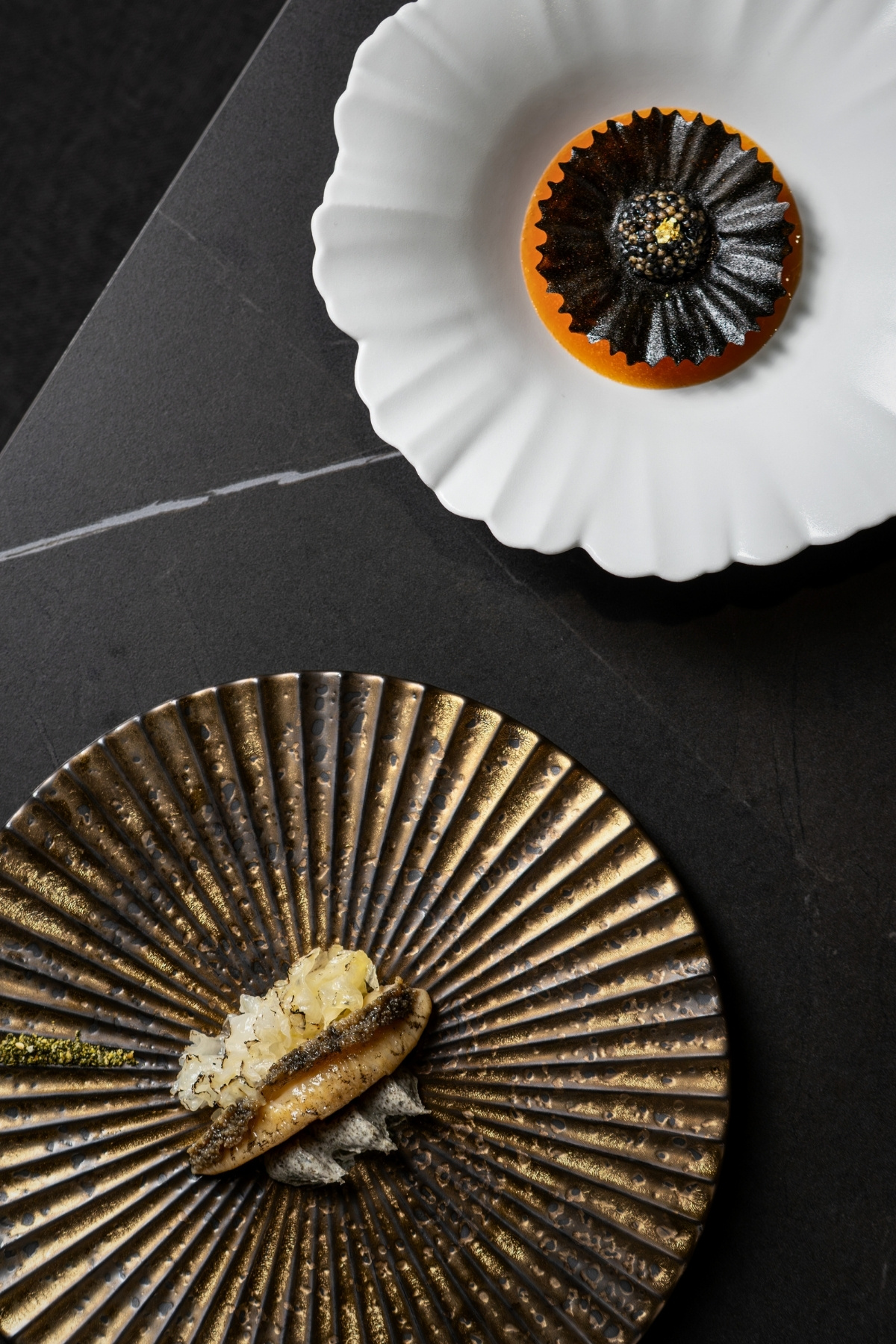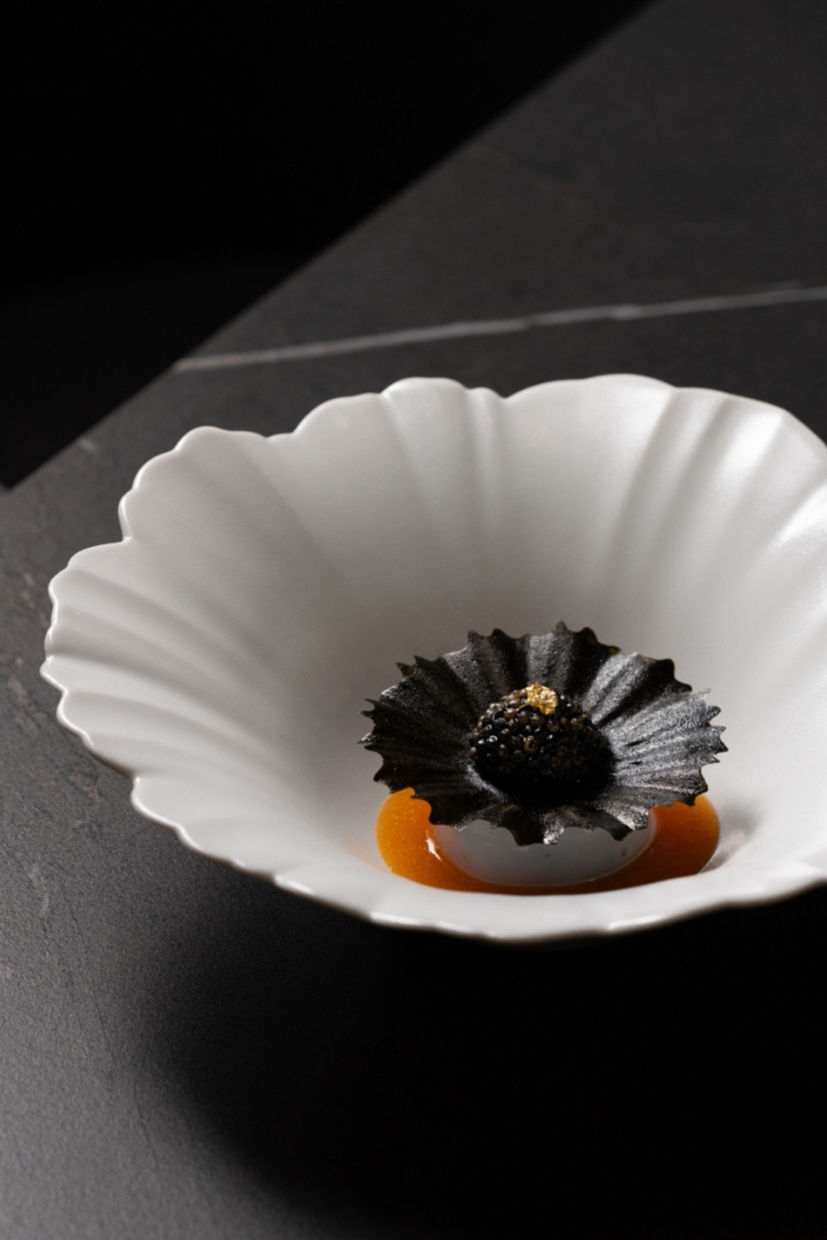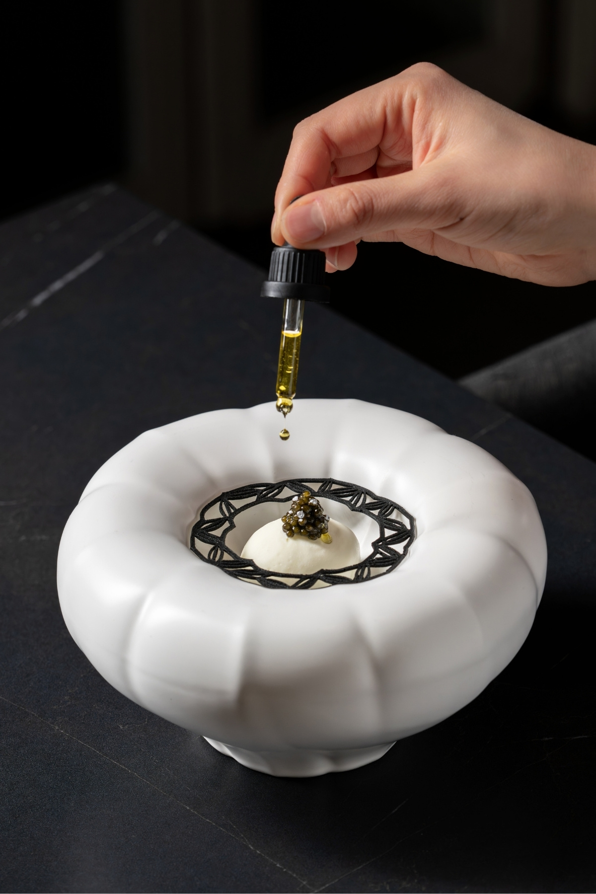 올리브 아이스크림에 들기름을 더하고, 트러플 튀일과 캐비어로 마무리해 향과 질감, 염도의 대비를 보여주는 소울의 디저트, ‘흑과 백’
