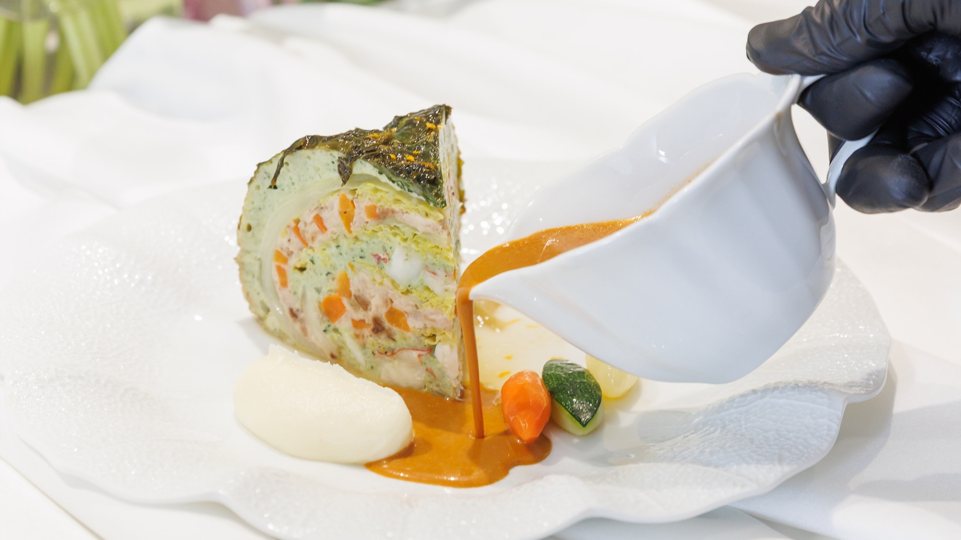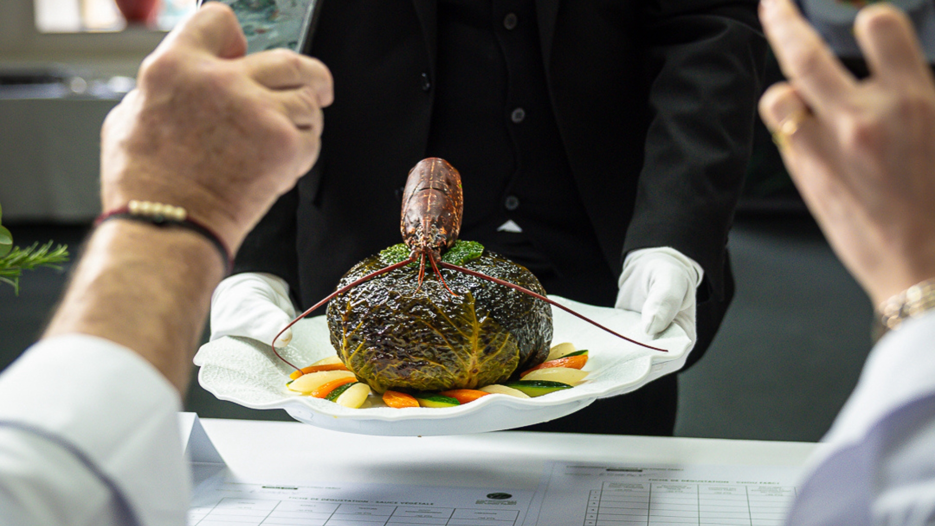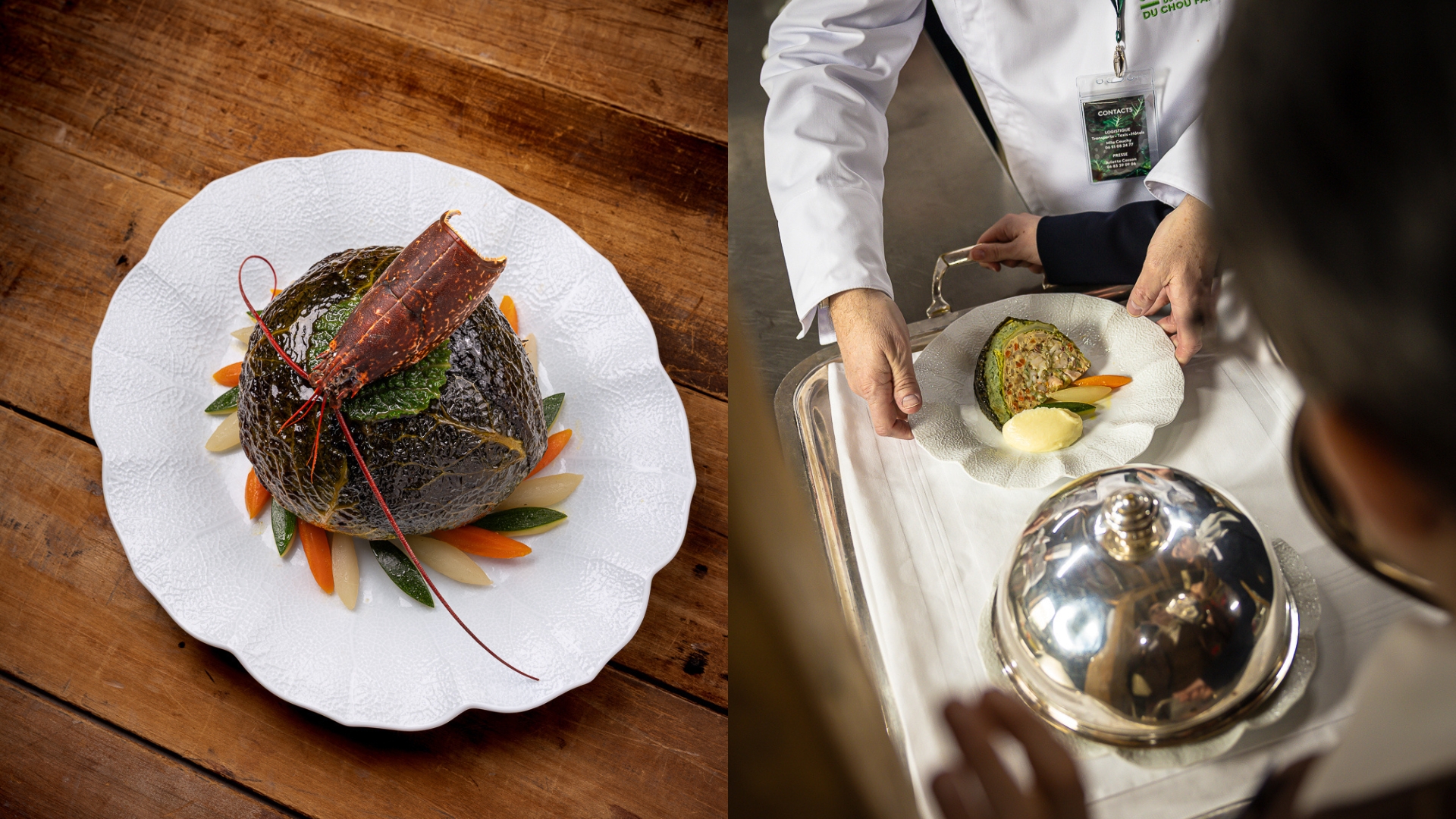 본선에서 재현한 정회완 셰프의 ‘민물가재와 닭을 넣은 통양배추 파르시’가 심사를 받기 위해 서빙되고 있다.