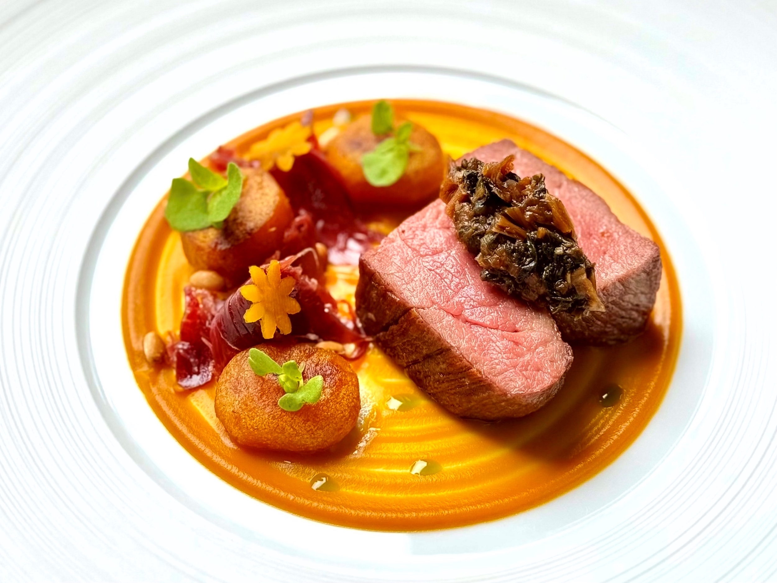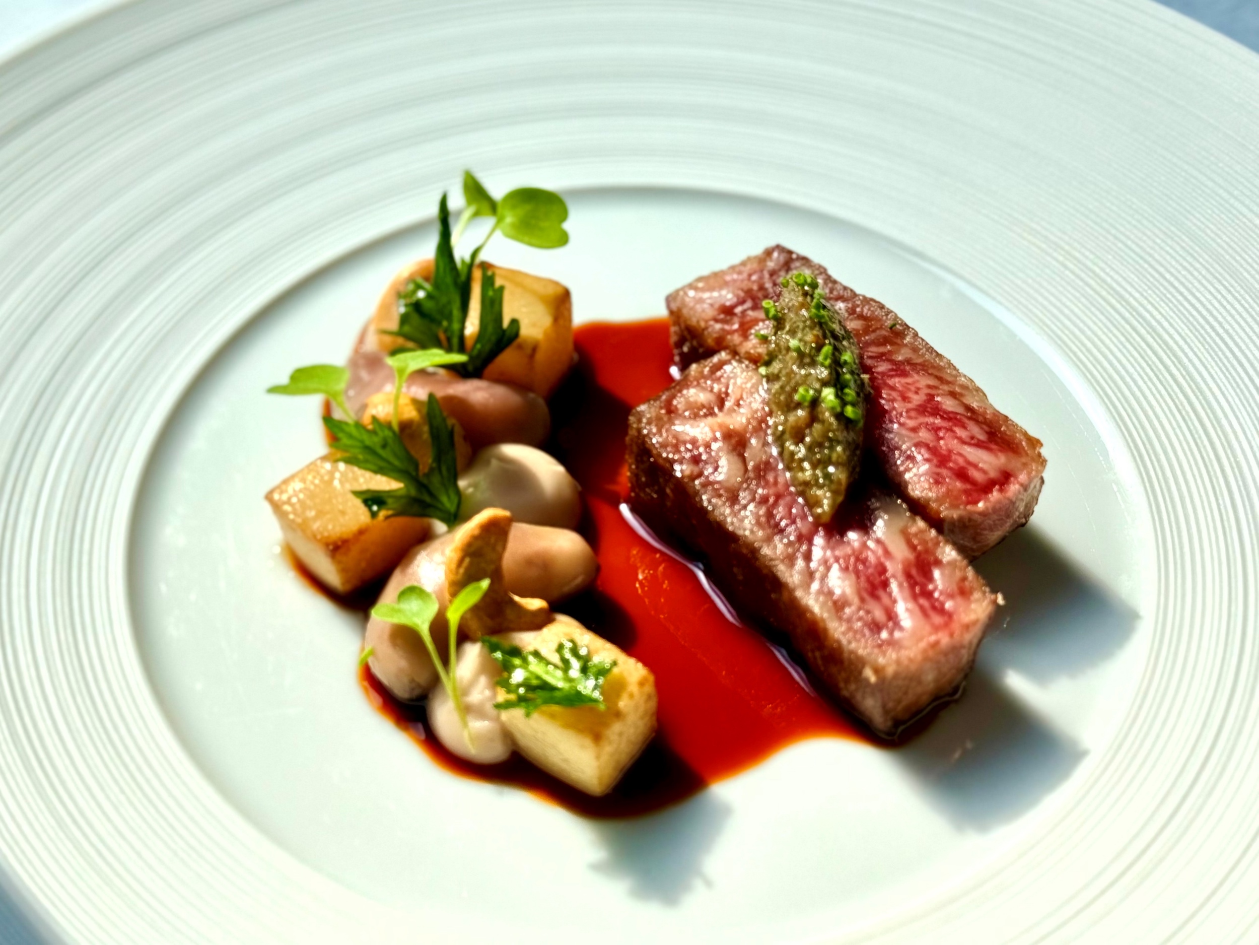 他將伊比利豬肩乾式熟成 7 日,使肉味和香氣更加集中。伊比利豬上疊著赤味噌梅乾菜,盤底再刷上一片南瓜赤味噌醬,搭配南瓜塊、Bellota 伊比利火腿及些許松子,最後澆淋金棗蜜餞肉汁,並以刺蔥油的香氣平衡豬肉油脂。