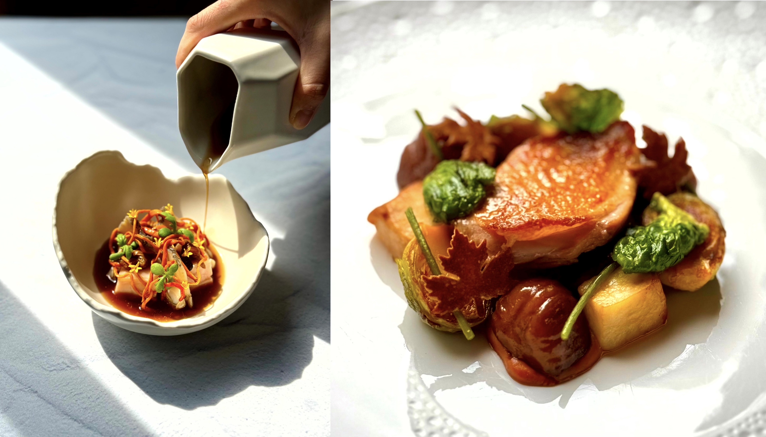 「島嶼秋光」(左)為家常湯品賦予細緻豐富的味覺層次。「栗嶼秋森」(右)以六龜鵪鶉為主角,並以牛肝菌醬汁和帕馬森起司栗子泥呈現山林大地氣息。