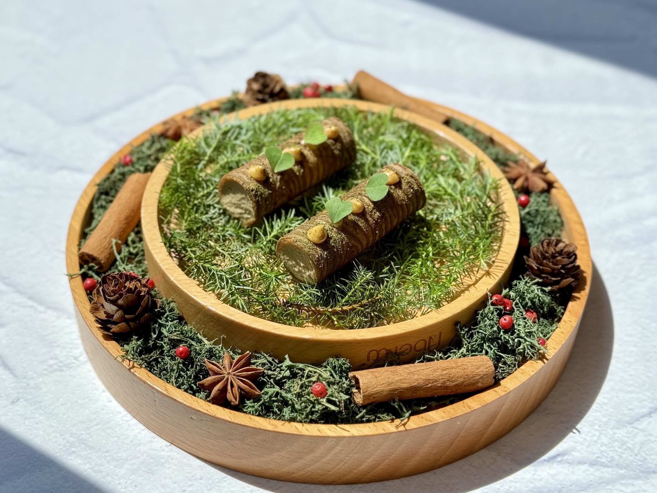 「秋嶺拾芳」將鵝肝醬填入焙茶蛋捲中,造型宛如林中掉落的樹枝。