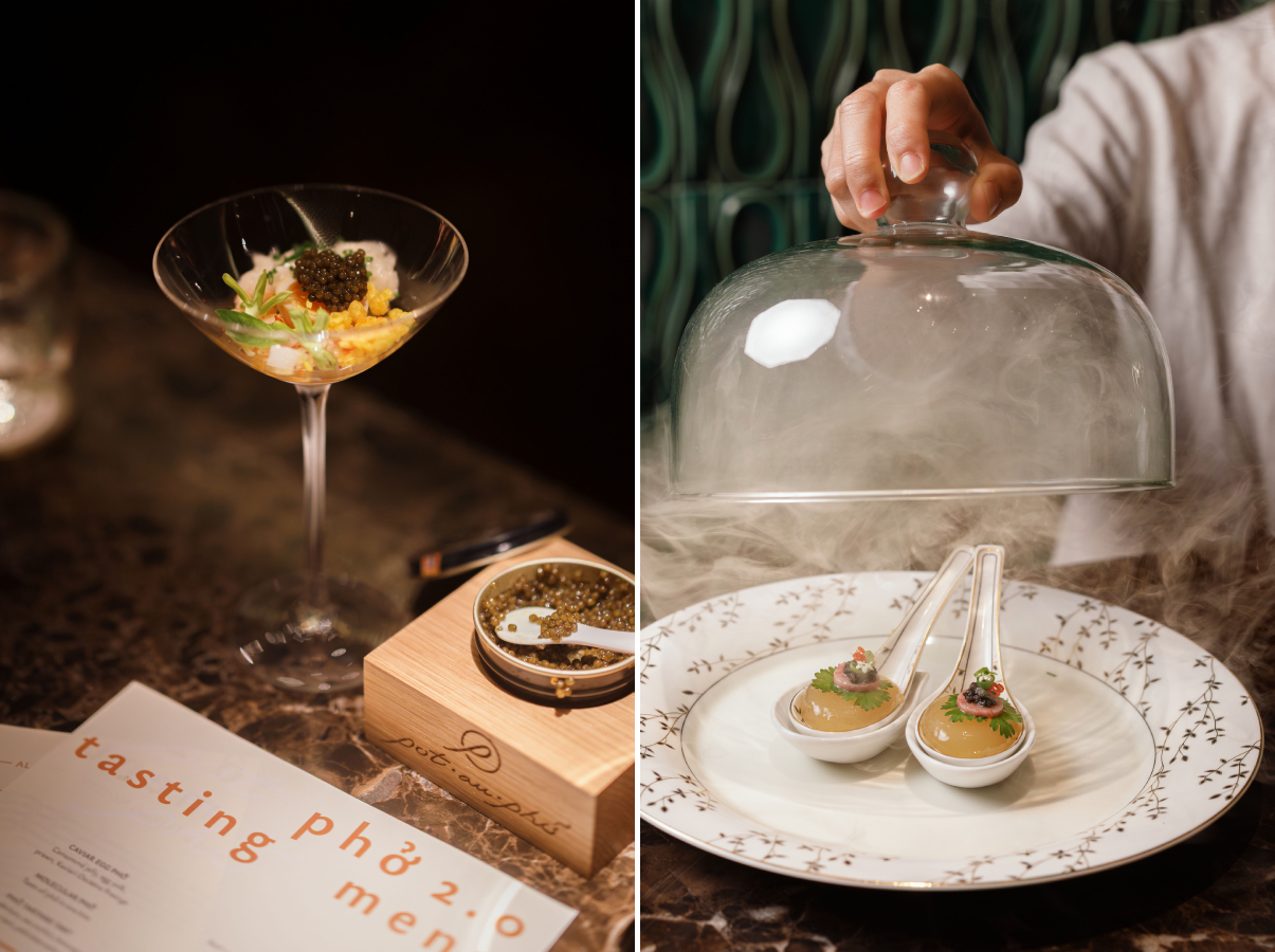 Peter 在 POT AU PHỞ 2.0 的試味菜單以風味精巧的小碟展開,如魚子醬蛋河粉(左)以及分子河粉(右)。