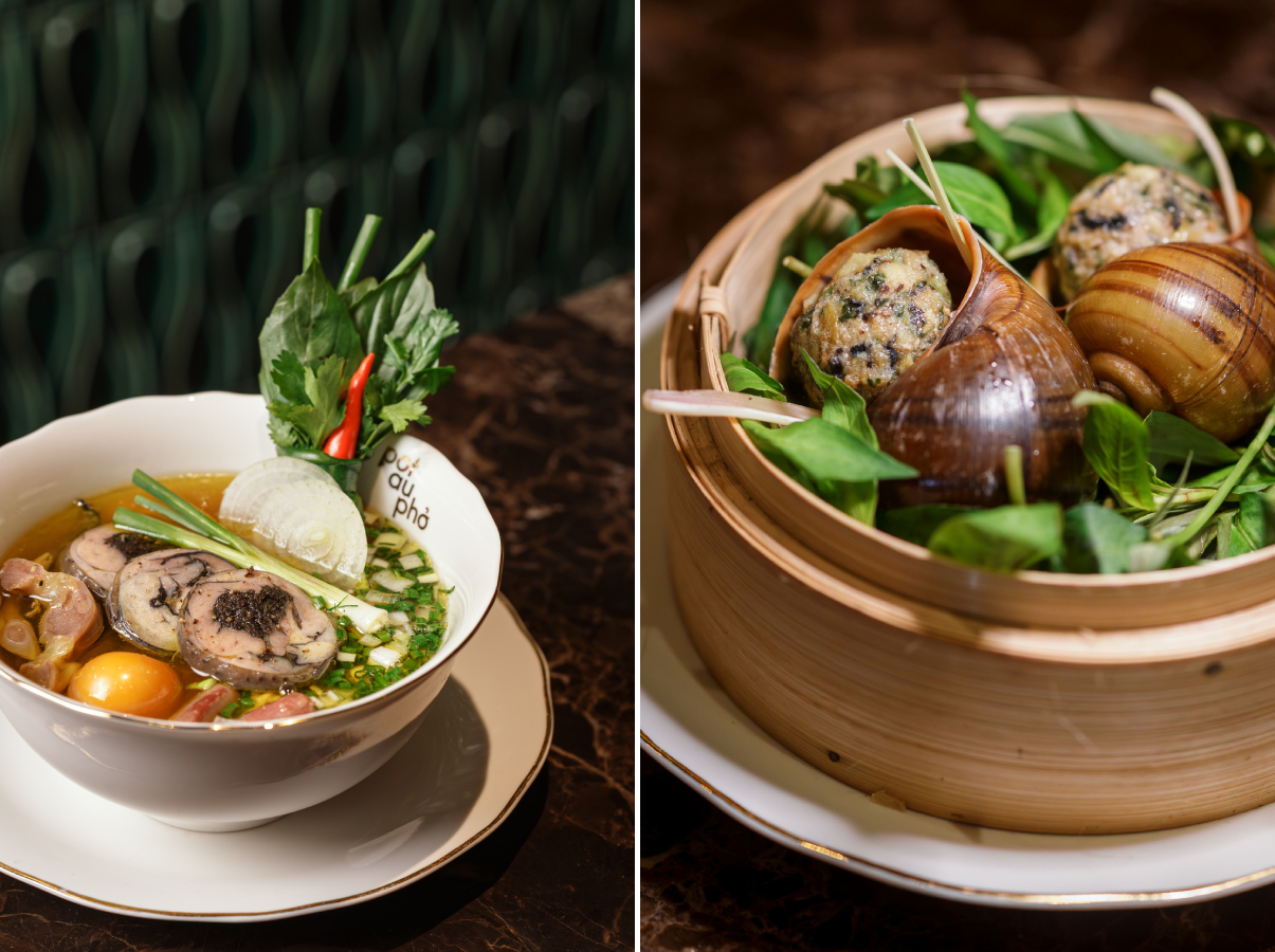 由此獲得的湯汁清麗透明,是精華,更是河粉的靈魂。POT AU PHỞ 2.0 的試味菜單以一系列風味精巧的小碟展開:魚子醬蛋河粉(Caviar egg phở)、分子河粉(Molecular phở)、酥皮肉派(Phở tartare tart),以上 3 道搭配香檳。此外還有西貢蝸牛、烏雞河粉等創新之作,搭配清酒。壓軸的 Le Pot Au Phở,以現代手法致敬名廚保羅.博古斯傳奇的松露酥皮湯,將這場湯粉之旅推向高潮。甜品黑松露河粉梳乎厘(Truffle phở soufflé)搭配烏龍馬丁尼,那像是「安可」了。