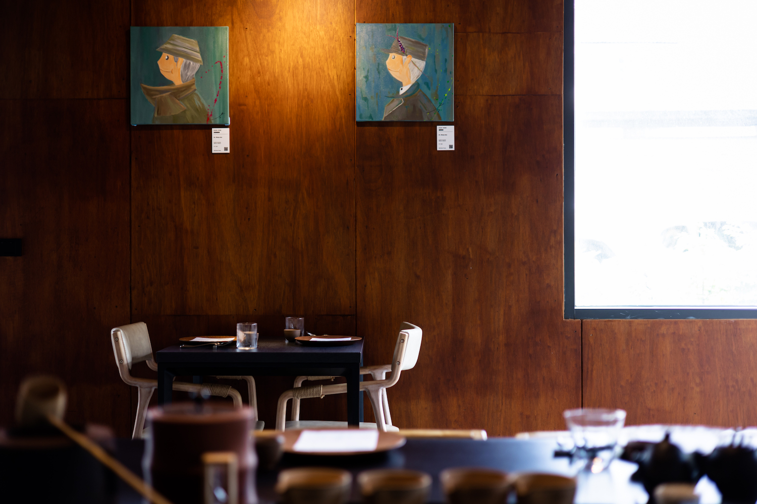 深色木牆為 KAORI 營造沈穩卻不失溫暖的氣氛,並掛上在地藝術家的系列畫作。