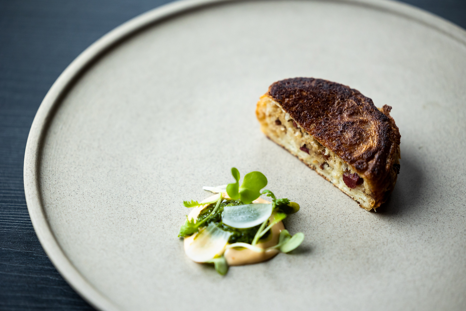 以店內招牌料理「餡餅 / 蘿蔔絲 / 韭菜」為例,他們將客家傳統菜包內的蘿蔔絲做為內餡,以英式煎餅取代中式麵皮包覆蘿蔔絲,煎至焦香酥脆。並將當地人吃水煎包與餡餅會沾的韭菜醬油,以法式料理手法將韭菜融入阿根廷青醬,加上帶有辣味的蝦醬美乃滋,擺盤後給人截然不同的新鮮感。那種吃起來熟悉卻又如鹹派般的細緻鹹香,的確是在風味中吟詠苗栗飲食文化的一道好創作。