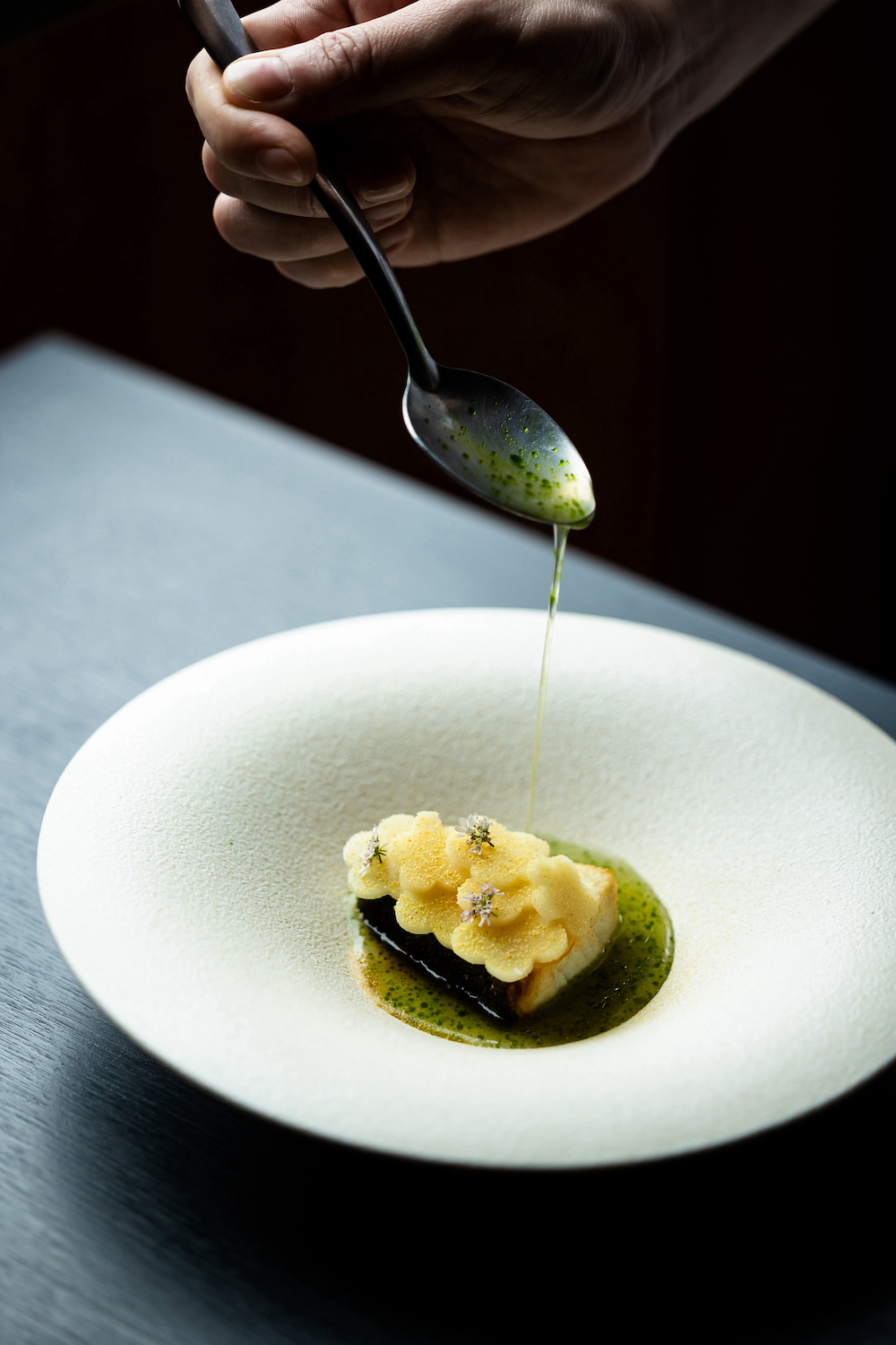 另一道「海鱺 / 梅乾菜 / 桶柑」則重新詮釋客家梅乾。以梅菜蒸魚為靈感,以當季的海鱺與竹筍、梅乾菜做為主軸,搭配在地桶柑製作成的桶柑果膠,以及將桶柑皮烘乾後製成的粉末,點綴著竹筍片,最後淋上使用梅乾菜與竹筍熬製的澄清醬汁。當我們以為這道菜嚐來將會是滿滿梅乾鹹味,淋在上頭的山茼蒿油卻讓原本沉重的風味突然明亮起來。