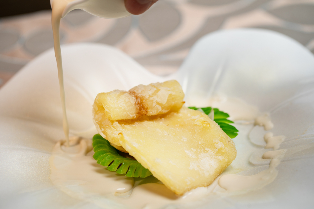 例如以「杏仁濃湯煎花膠」來說,就是最好地解釋 Jayson 如何將傳統元素運用自如。研發這道料理的背景源自 2017 年萬豪金殿推出五行宴,概念取自《黃帝內經》,5 種不同顏色的菜色對應金木水火土,能滋補各種內臟。金對應的顏色為白,所以發想這道杏仁濃湯煎花膠為的是補肺。