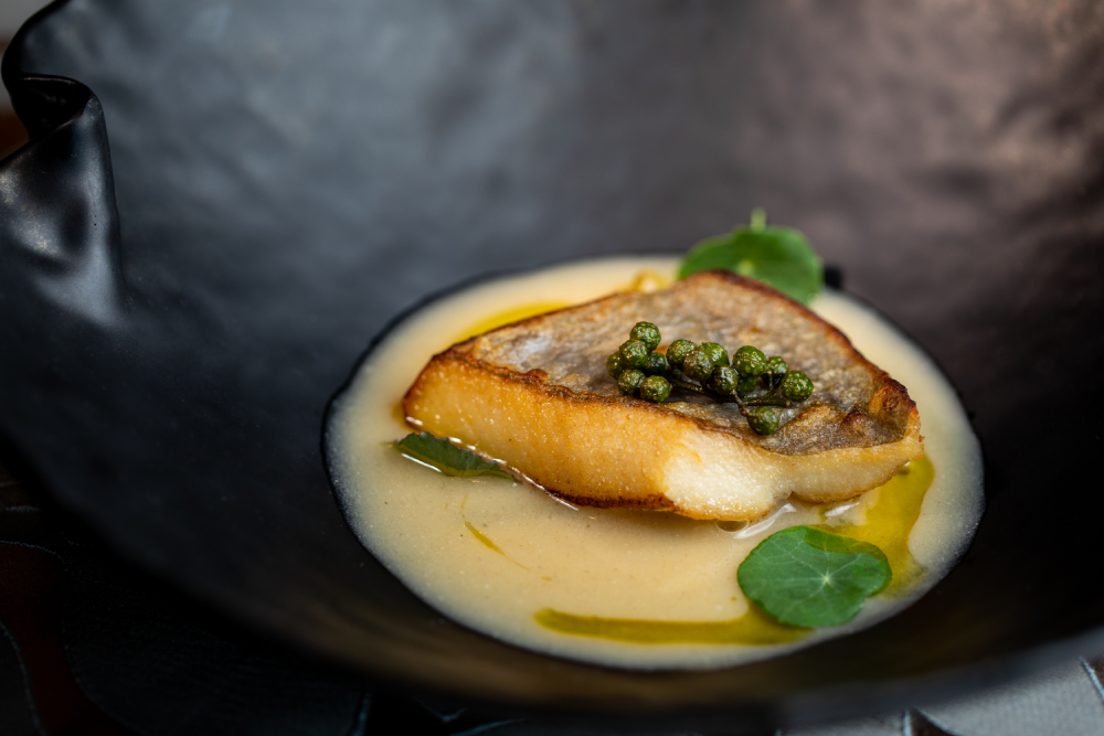 所以這當然不是一道傳統的酸菜魚菜色,但他把各個條件兜齊,將傳統酸菜魚的直白味道轉譯成細膩優雅的形象,有魚湯的鮮香,有酸菜的爽口,隱微的辣感,再加上芬芳的花椒氣息。鷹倉魚是潮州菜常用到的食材,油脂豐富,煎烤後搭配酸湯便能平衡肥油的膩感。