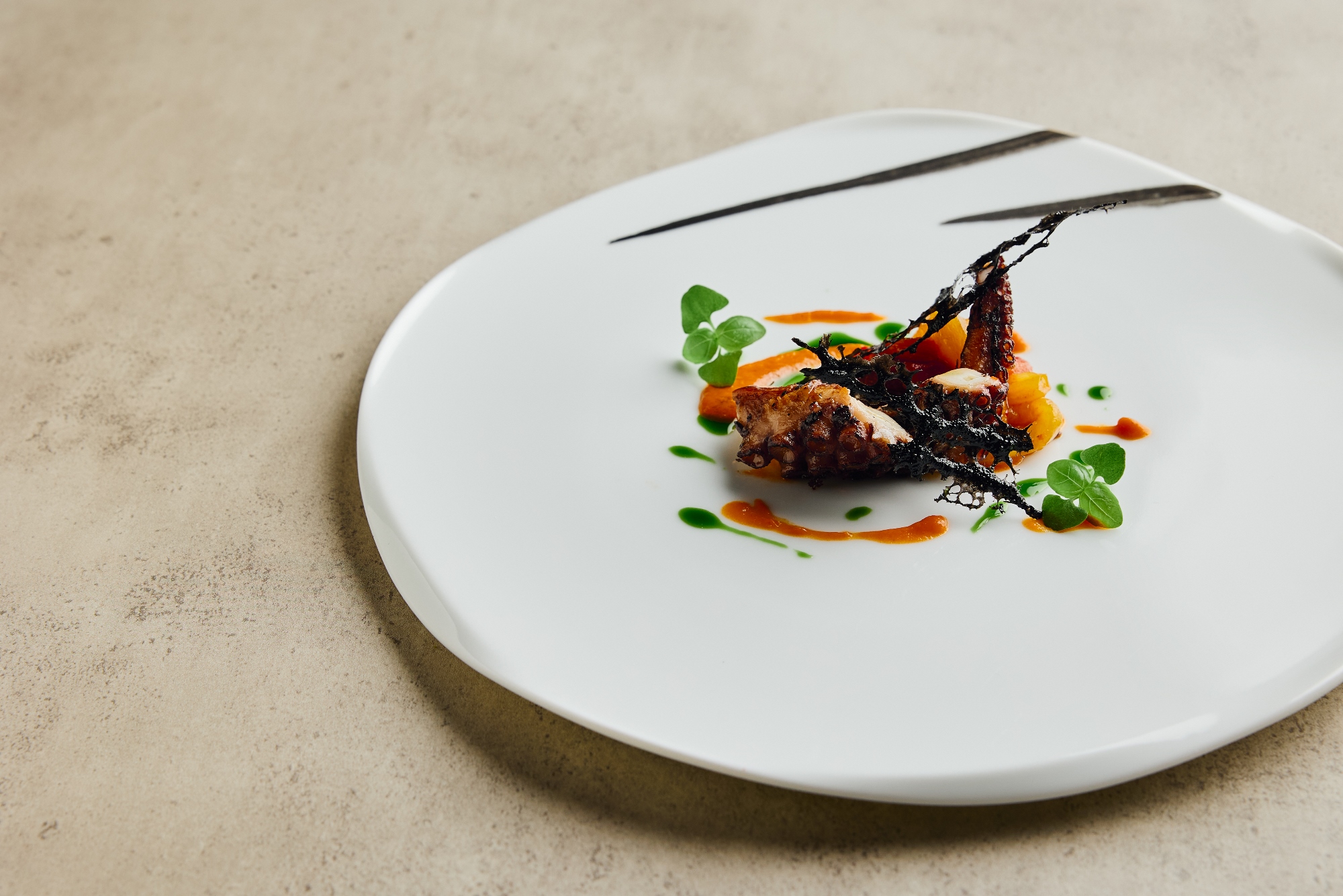 舒肥能讓章魚軟嫩,但江丕禮仍採用當年 Angelo 教他的方法:將章魚放入高湯裡燉煮,煮完離火燜數小時,讓章魚吸附高湯裡香料蔬菜的味道。章魚搭配生味盡除、只餘甜味的義式燉甜椒(Peperonata),以及烤紅椒堅果醬(Romesco),在法式料理中投放歐洲海岸的風光。