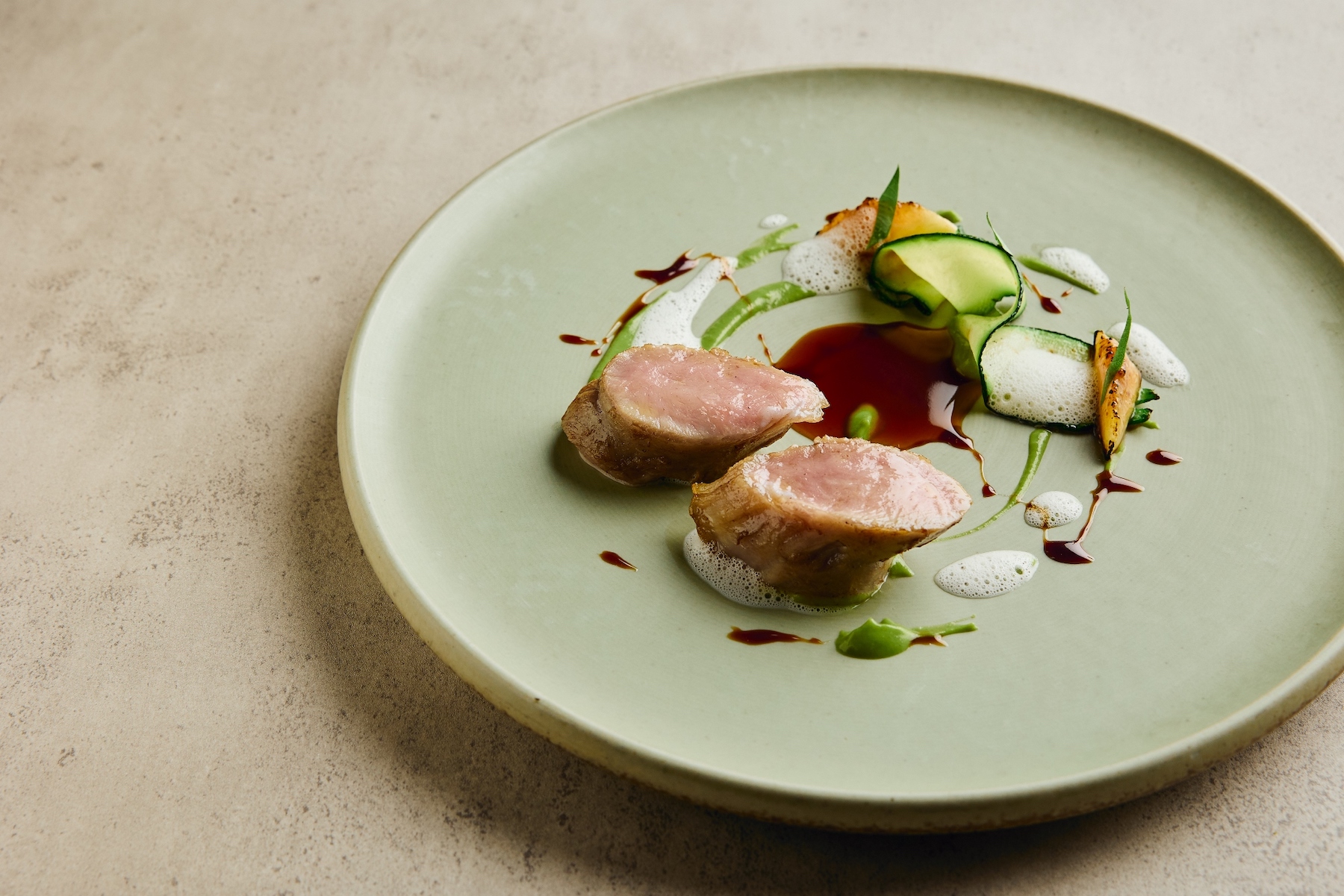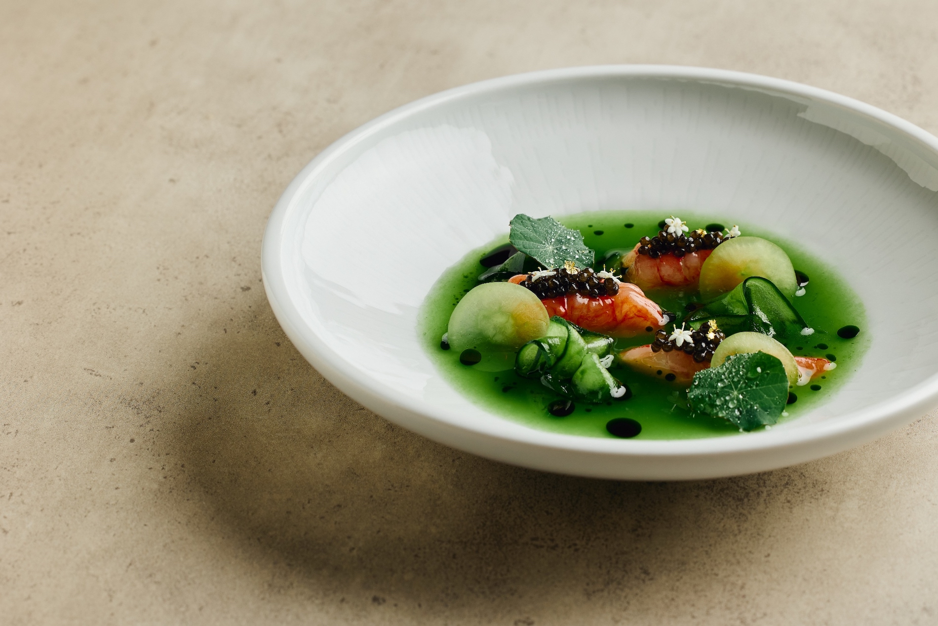 時值炎夏,瓜果是當季又消暑的飲食選擇。冷前菜「綠意」在盤中編排深深淺淺的綠——青葡萄片的淡綠透著光,小黃瓜薄片有暗綠的瓜皮勾勒邊緣,帶著水珠的金蓮葉宛如池塘裡的蓮葉。清澈淺綠的「湖水」飽含瓜果香氣,冰涼中藏著一絲芥末的嗆。豔紅的生胭脂蝦則是湖中隆起的小島,瓜果的清新讓胭脂蝦的甜味出落得嬌豔迷人。