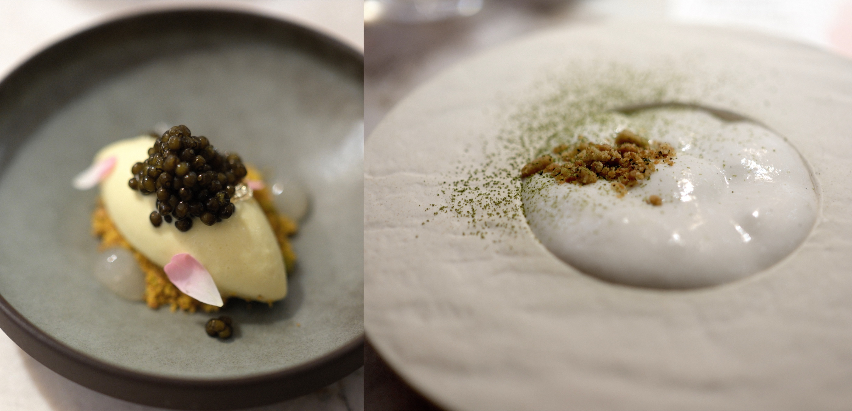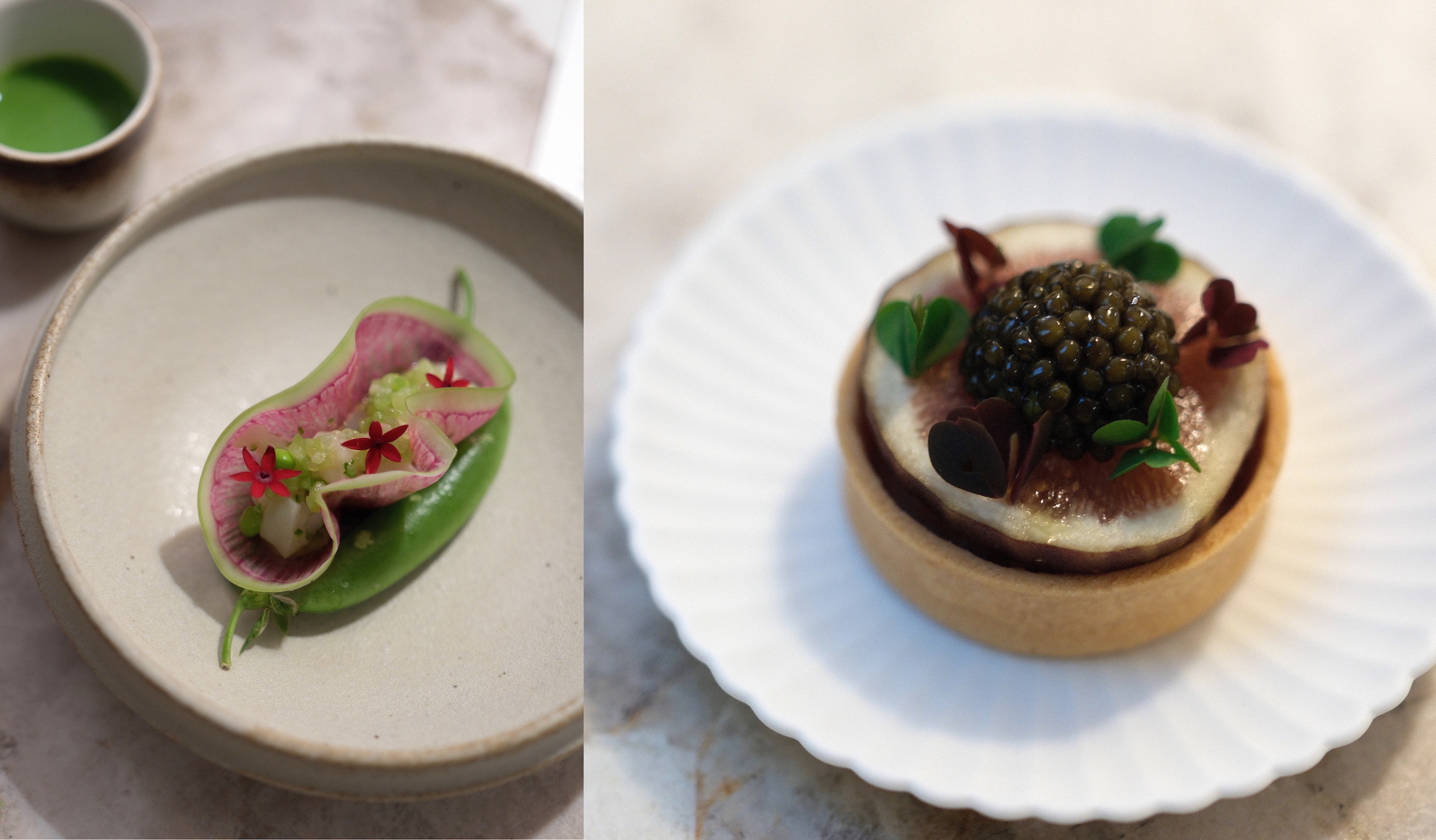 「別海町干貝 / 西瓜蘿蔔『塔可』」(左)用西瓜蘿蔔片做成干貝口味的塔可。「鴨肝無花果塔 / 魚子醬」入口濃郁鮮甜,風格明快。