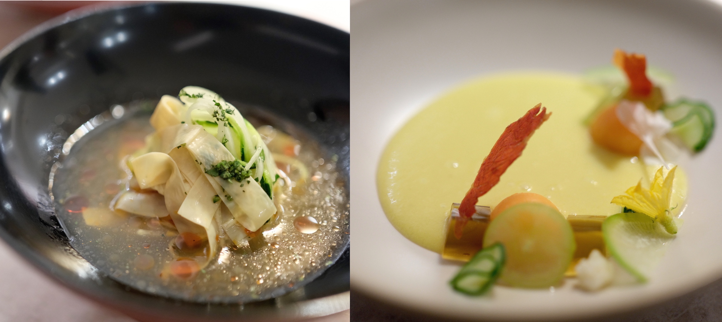 「亞參叻沙櫛瓜麵」(左)原型來自檳城風格的叻沙。「日本哈密瓜冷湯」(右)則致敬西班牙瓜味冷湯。
