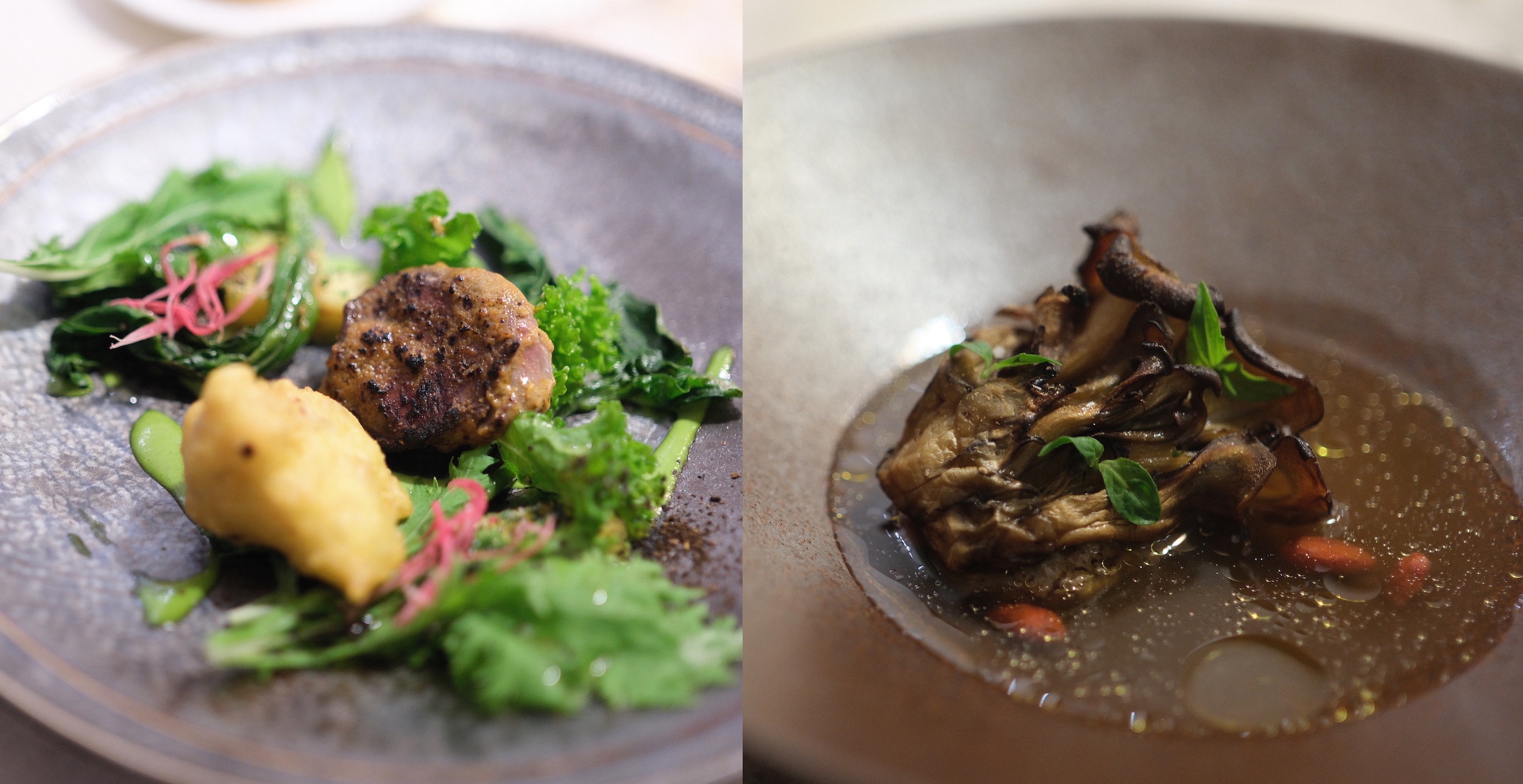 坦都里羅惹沙拉(左)將鴨心做成肉餅炙烤。香煎舞菇鴨肝(左)則將肥腴的鴨肝配上風味濃郁的舞菇。