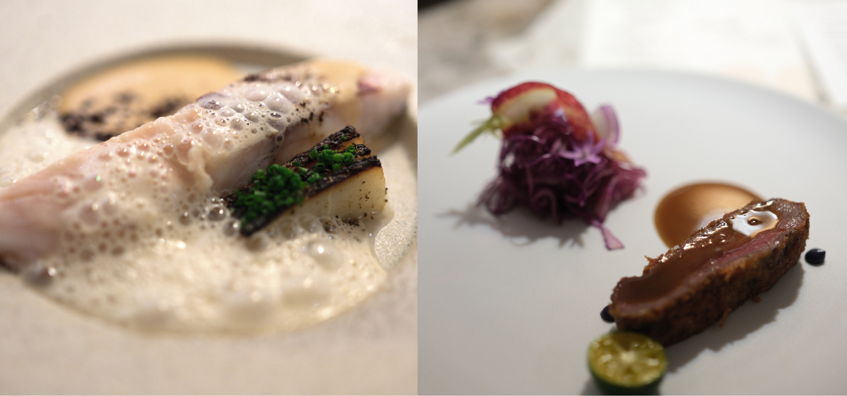 奶香清蒸魚(左)讓清甜雪白的魚肉跟筍,碰撞上濃郁帶有梅納反應風味的奶醬汁。炸鹿肉排(右)借用日式炸豬排的概念,做出熟度完美粉紅不帶血的炸鹿肉排。