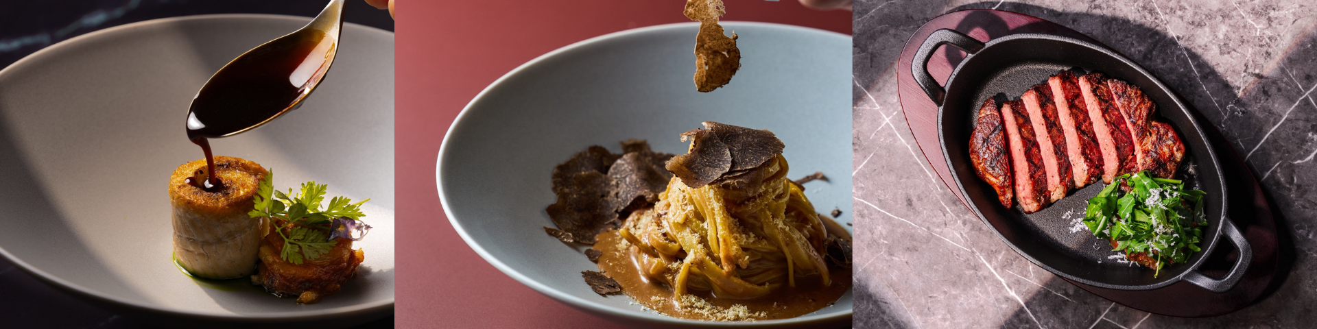 由左至右「嫩煎鰻魚搭配鴨醬汁與圓茄」、「限量松露榛果麻醬手工麵」和「義式風味碳烤 PRIME 肋眼心」。圖片提供:你家樓下 downstairs。