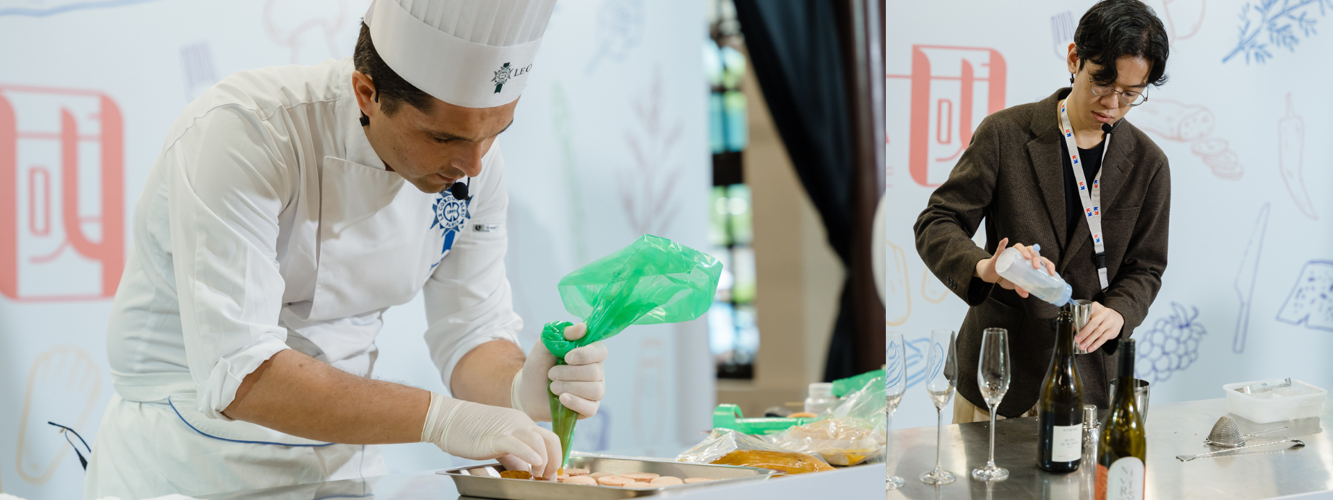 活動首日的媒體主廚展演以「法式餐前酒文化」為題,與適逢創校 130 週年的法國藍帶廚藝學院合作,邀請高雄藍帶廚藝學院甜點主廚 Joan Berton 示範鴨肝馬卡龍,運用阿爾薩斯悠久的品牌喬治柏客(Georges Bruck)鴨肝醬搭配熱帶水果醬,創造酸甜與醇厚並存的口感層次。隨後,由知名無酒精調飲師、「一時無酉」創辦人黃心皓(小白)現場調配無酒精版本的 French 75,以草本風味液取代琴酒,加入檸檬汁與糖漿,再搭配無酒精氣泡酒,帶來平衡、清爽且細緻的層次。兩場展現充分展示法式餐飲文化中「優雅不設限」的精神。