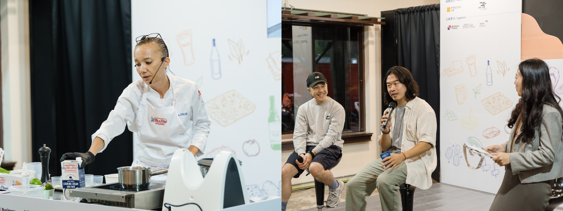 米其林二星主廚 Florence Dalia 示範愛樂薇酸味鮮奶油與奶油乳酪的創新應用;名廚論壇則由高晟凱與陳毓夫主廚對談「餐酒日常」,探討法式餐飲融入生活的可能。