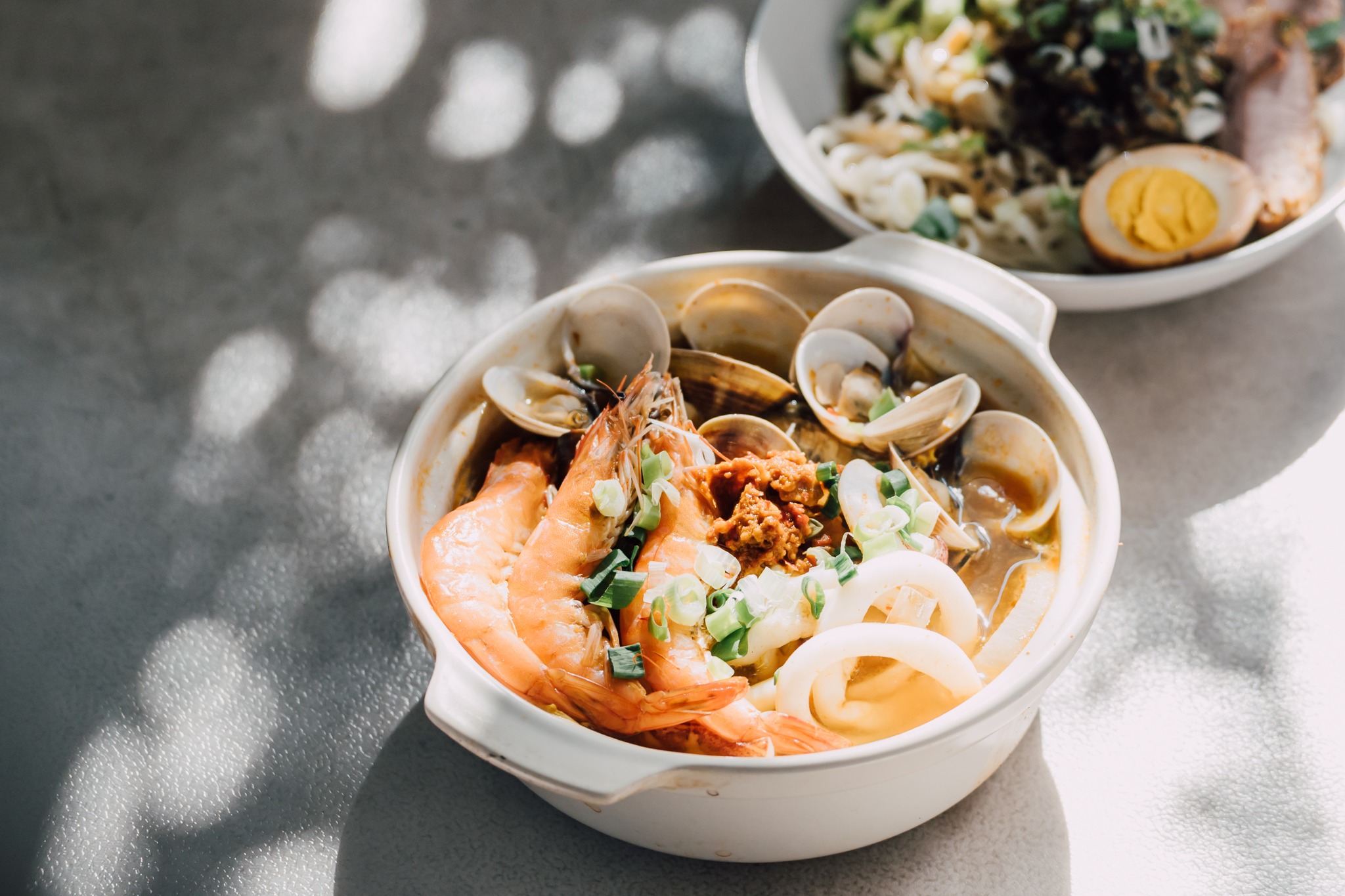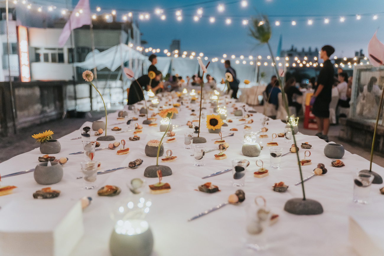 賓客們走至建築物 3 樓的露台,迎接的是鋪上白桌巾的長餐桌。桌面放了彰化烏魚子、炸紅白湯圓、加上彰化特色醬料「番薑醬」的九孔鮑魚,以及在地沿海生產的「大和黑蜆」無調味蜆湯精華。蜆湯精華喝之前在手掌虎口放鹽,舔鹽後一飲而盡,仿效龍舌蘭 Shot 喝法。