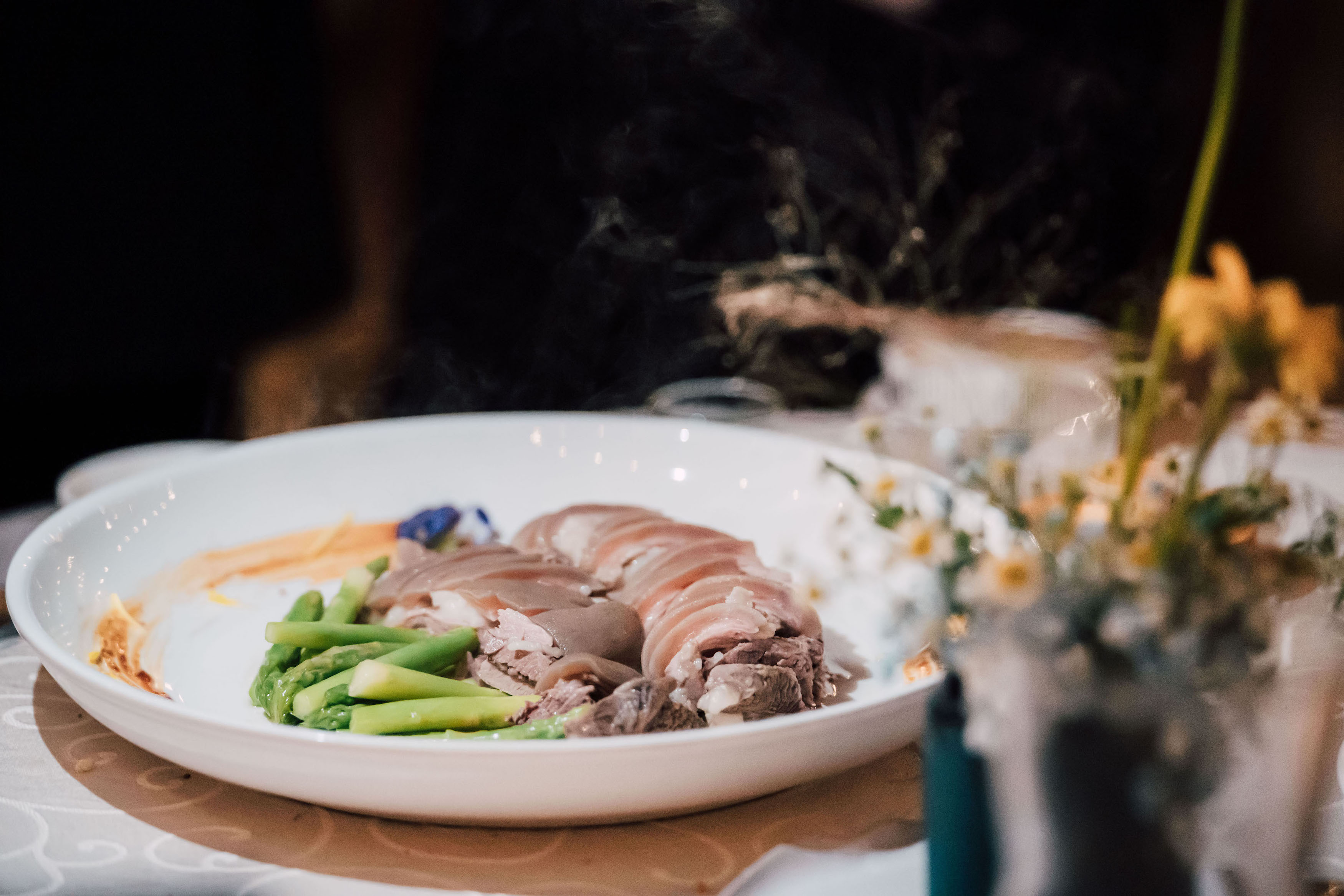 在「沐暮尋風」天台晚宴裡,天香羊肉爐端出淺色滷水製備的白灼羊肉。肉質鮮嫩,羊皮多膠質軟糯,可以蘸羊肉爐常見的豆腐乳醬吃,亦可搭配天香羊肉爐女主人吳宜家發明的煙燻紅椒粉鹽蘸水吃,特別爽口。