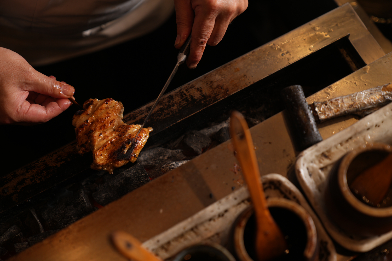 從挑選禽鳥到最後翻動紀州備長炭的步驟,每一步都有其獨特的意義。在餐廳可容納 16 位客人的 U 形吧台上,客人可以近距離欣賞廚師們因應每一個雞肉部位而特別調整的烤肉節奏,火候、調味和旋轉,絕不千篇一律,讓每一片肉都層次分明、口感豐富,展現出獨特的口感和溫度,只有真正的大師才有這樣的技術。