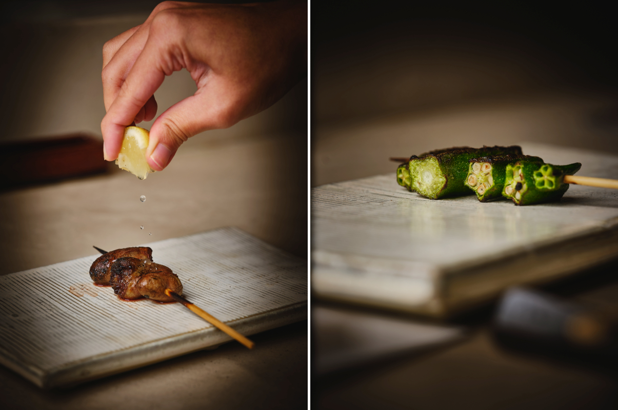 晚餐以「廚師發辦」的形式展開,客人可以品嚐一系列餐廳的招牌烤肉串和菜餚,同時體驗經典的烤串燒技藝,如塗醬料、調味和備長炭烤製等。餐單上令人垂涎的本地著名三黃雞雞肉部位包括雞胸肉、里肌肉、雞頸、雞翼、雞腿、雞胗、雞心、雞肝、雞尾以及著名的 Tsukune 肉丸,每一個部位都經過特別處理,以展現其細膩的口感和風味。一系列時令蔬菜、特別由日本進口的內臟美食、精心烹製的熱食,以及時令的喚醒味蕾小食,將會於晚餐過程中穿插,交織成精彩的用餐體驗。