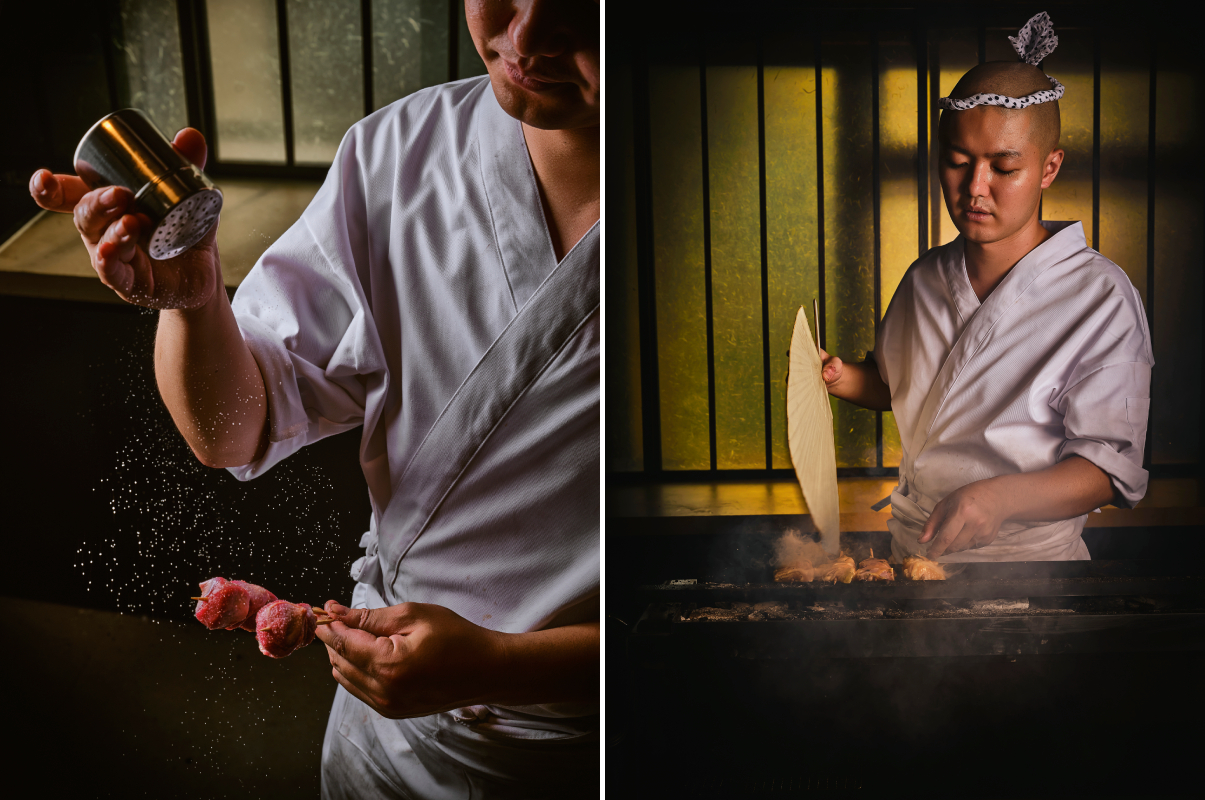 香港主廚松井亮(右)是池川先生的得意門生,他將十數年的精湛技藝注入 Torikaze 的首間香港分店;在餐廳可容納 16 位客人的 U 形吧台上,客人可以近距離欣賞廚師們因應每一個雞肉部位而特別調整的烤肉節奏,火候、調味和旋轉,絕不千篇一律。