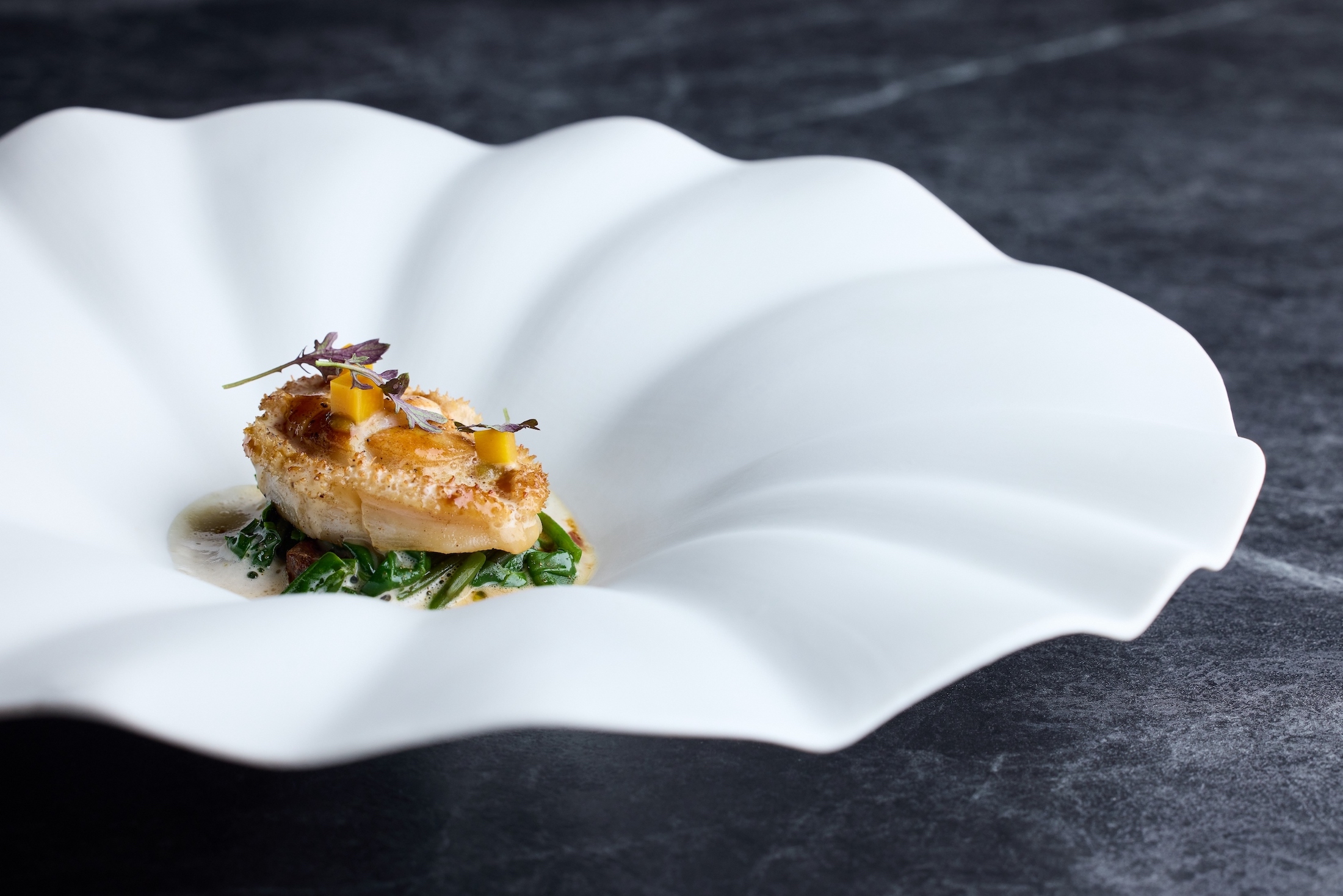 南非鮑魚先經過敲打,才能讓緊縮的肉質變得鬆弛,再以奶油香煎。鮑魚之下鋪著帶皮烤菊芋,搭配炙燒皇宮菜,以及蛤蜊汁為基底的法國黃酒醬。鮮醇濃郁的黃酒醬將鮑魚鮮味再拉高一層,菊芋和皇宮菜的苦韻收住醬汁的膩感,海洋與大地滋味在盤中相遇,且和諧平衡。