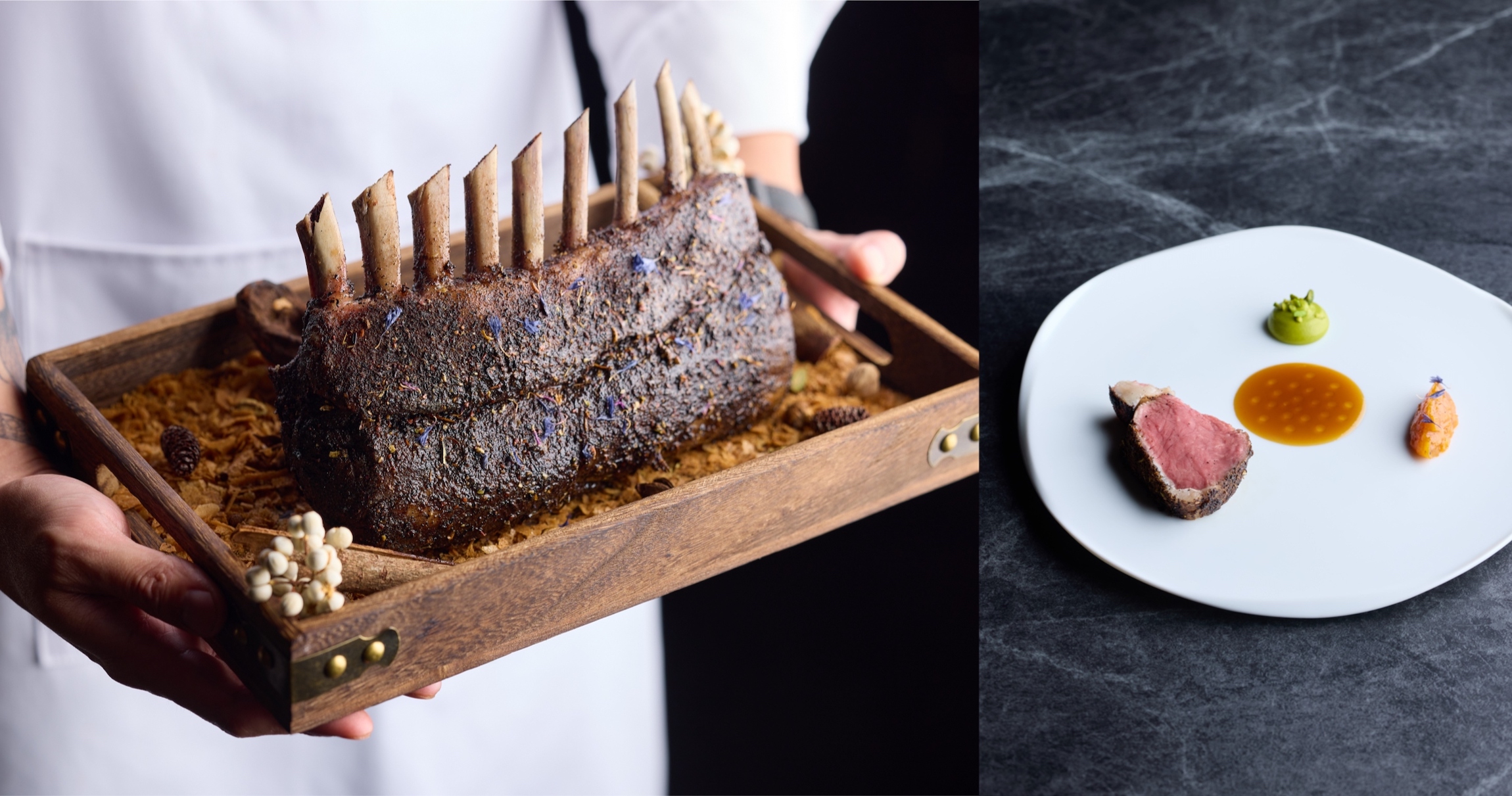 在料理上桌前,「澳洲海濱和羊・開心果・杏桃・冬日香料」會以完整帶骨羊排的樣貌向客人展示。羊排表面鋪滿辛香料,還有細小的藍色矢車菊花瓣點綴。「台灣人冬天很喜歡吃羊肉爐,會用中藥材燉煮肉,我想要做一個以西式香料為主體的羊肉料理。」江丕禮說。