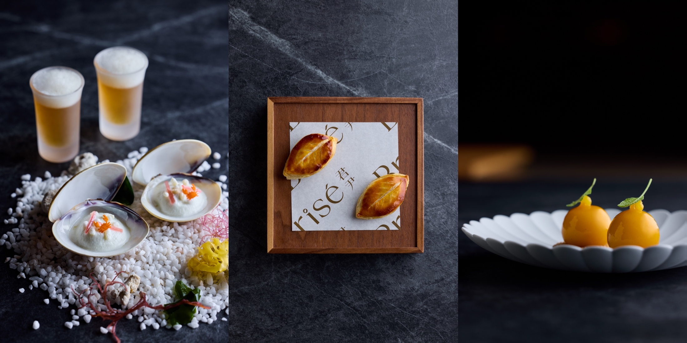 開胃小點由「蛤蜊・茗荷・澄清雞湯」(左)、「油封櫻桃鴨・香料紅酒・千層酥皮」(中)和「金棗・波弗乳酪・榛果」(右)組成。