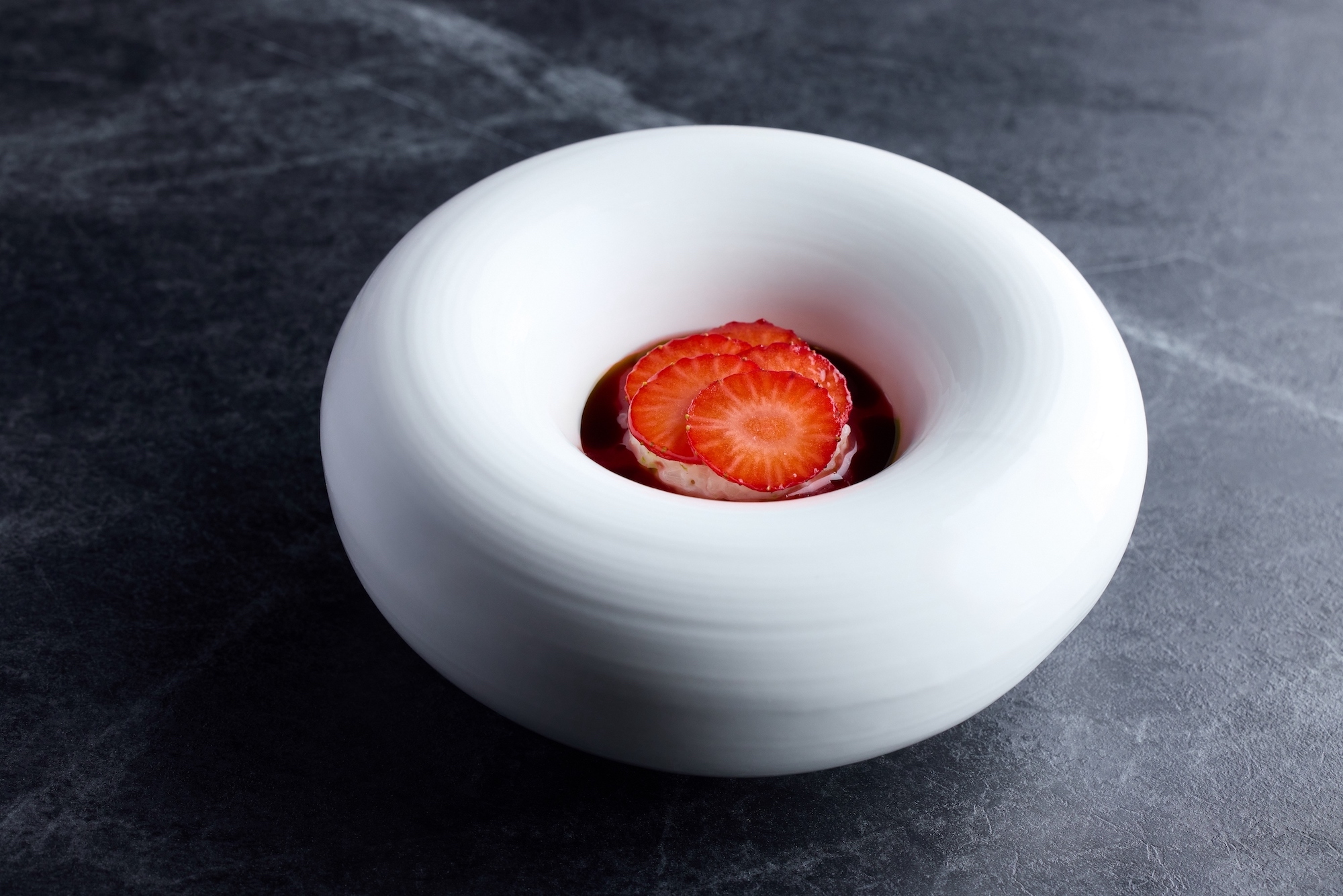 「草莓・七星米・羅勒」以軟滑的米布丁為載體,展現新鮮與發酵草莓的不同面貌。