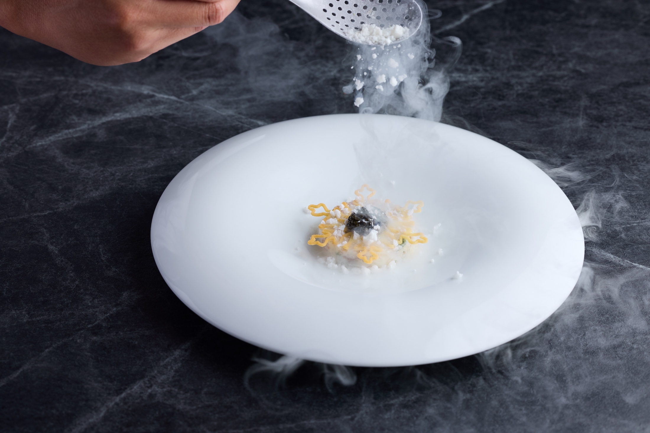 另一道具冬季意象的料理,是「日本鰤魚・魚子醬・發酵蜜棗・馬鞭草」。當白色粉末落入盤中,激起的白煙宛如冬季山間的冷冽雲霧——那是發酵蜜棗汁製成的細雪,以發酵的酸襯托肥美的日本鰤魚塔塔,清爽又細緻地勾勒味覺。