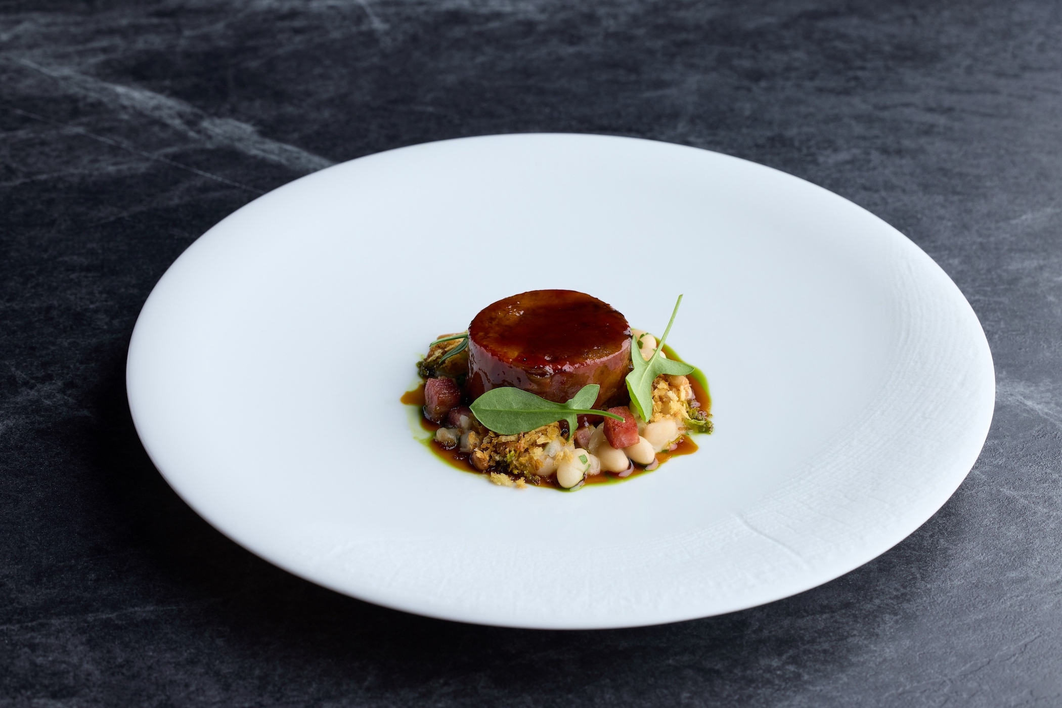 江丕禮改變 Cassoulet 所有食材一起燉煮的作法,讓「澳洲和牛舌・燉白豆・湖南臘肉・百里香」風味更乾淨且層次分明。
