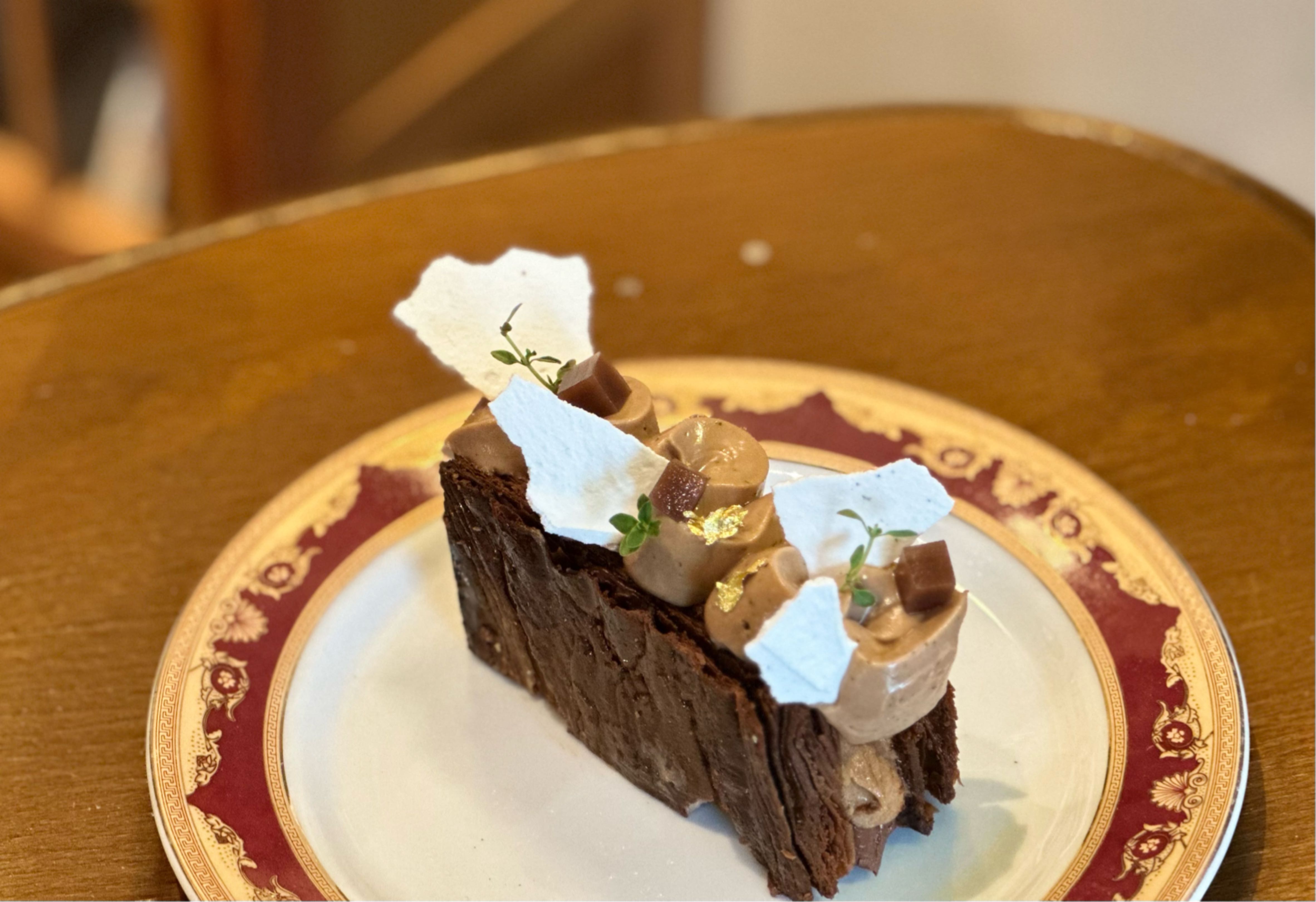 九日良田位於花東縱谷內的玉里,主廚 Amber 希望透過甜點,讓更多人認識花東特色茶味。因此使用縱谷的蜜香紅茶製成香緹鮮奶油,搭配屏東黑巧克力及牛奶巧克力製成的香緹,與鹽之花焦糖奶餡。即使內餡風味較厚實,發酵奶油做為派皮的裹入油,使得千層整體口味仍舊平衡、清爽。